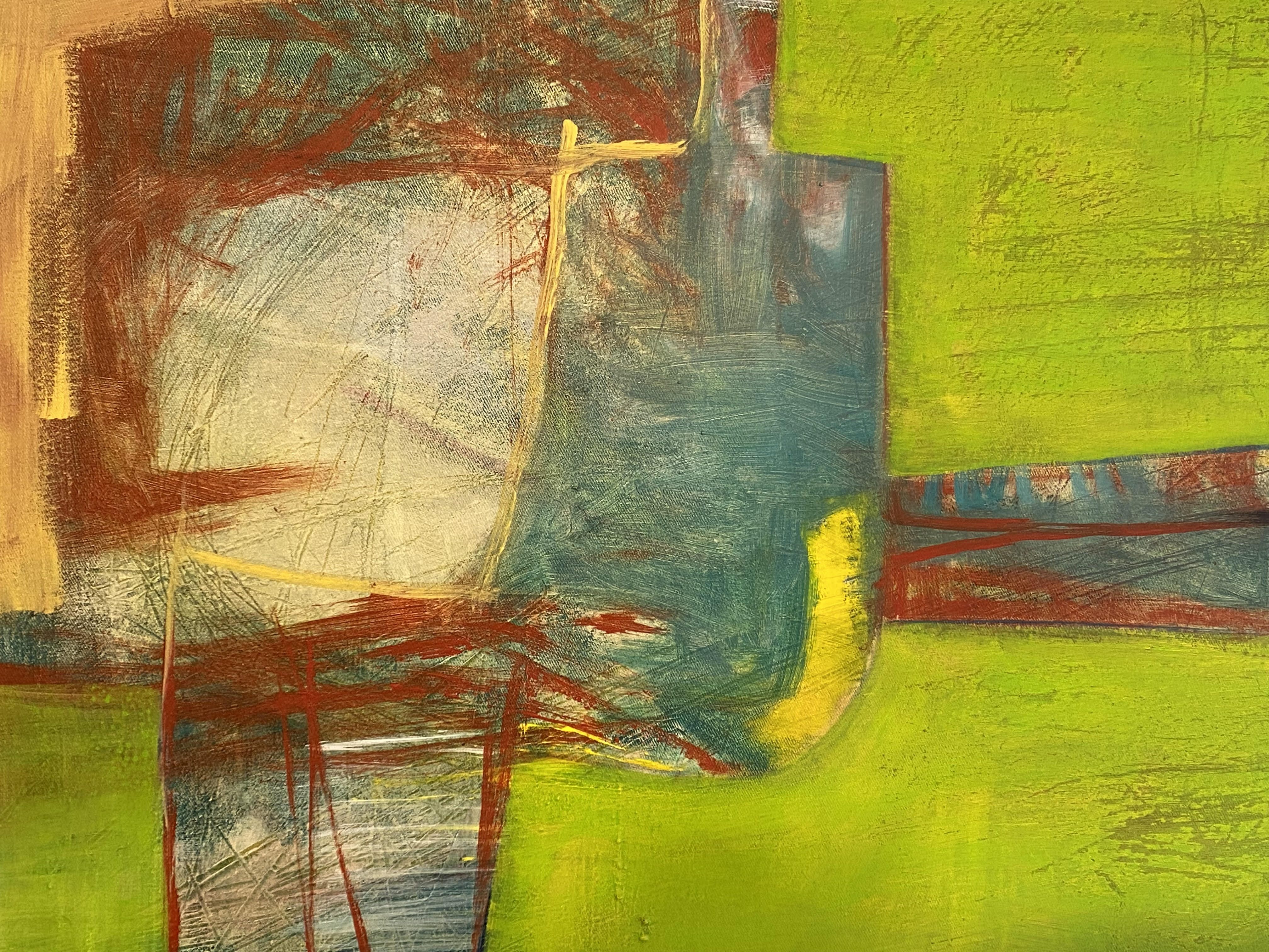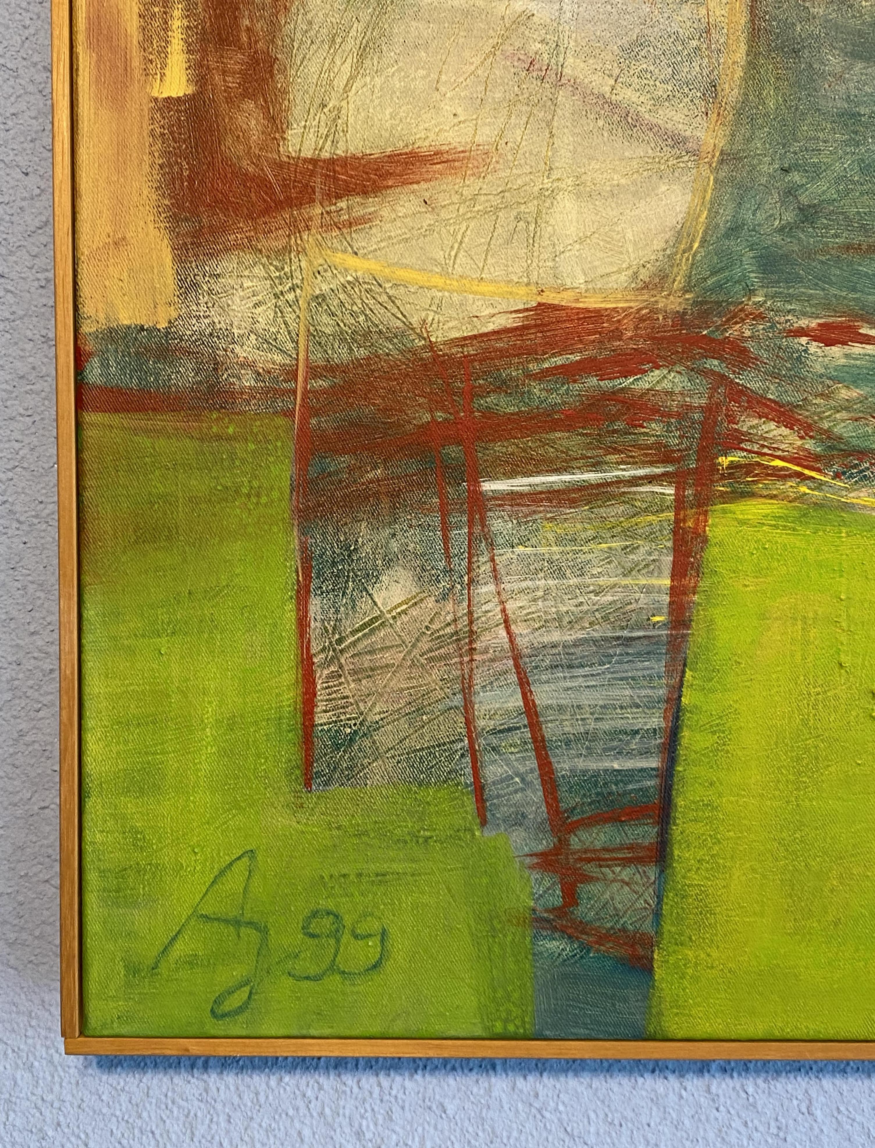 Janle, Annette (1960 Stuttgart – 2016 Tübingen): ‚o. T.‘ : unten links signiert, datiert : Acryl auf Leinwand auf Holzrahmen gespannt : mit Holzleistenrahmen umfasst : Tübingen, 1999. 40 x 65 cm, 1980–1984 Studium Sozialpädagogik, 1994–1996 Kunstseminar Freie Hochschule Metzingen, Offener Studienbereich.– seit 1996 freischaffende Künstlerin.– seit 2002 freie Lehrtätigkeit.– 2014 Artist in Residence Hrisey/Island.– Mitglied im Verband Bildender Künstler Württemberg (VBKW) und im Künstlerbund Tübingen.– Atelier in Tübingen.– frühzeitiger Tod 2016.–