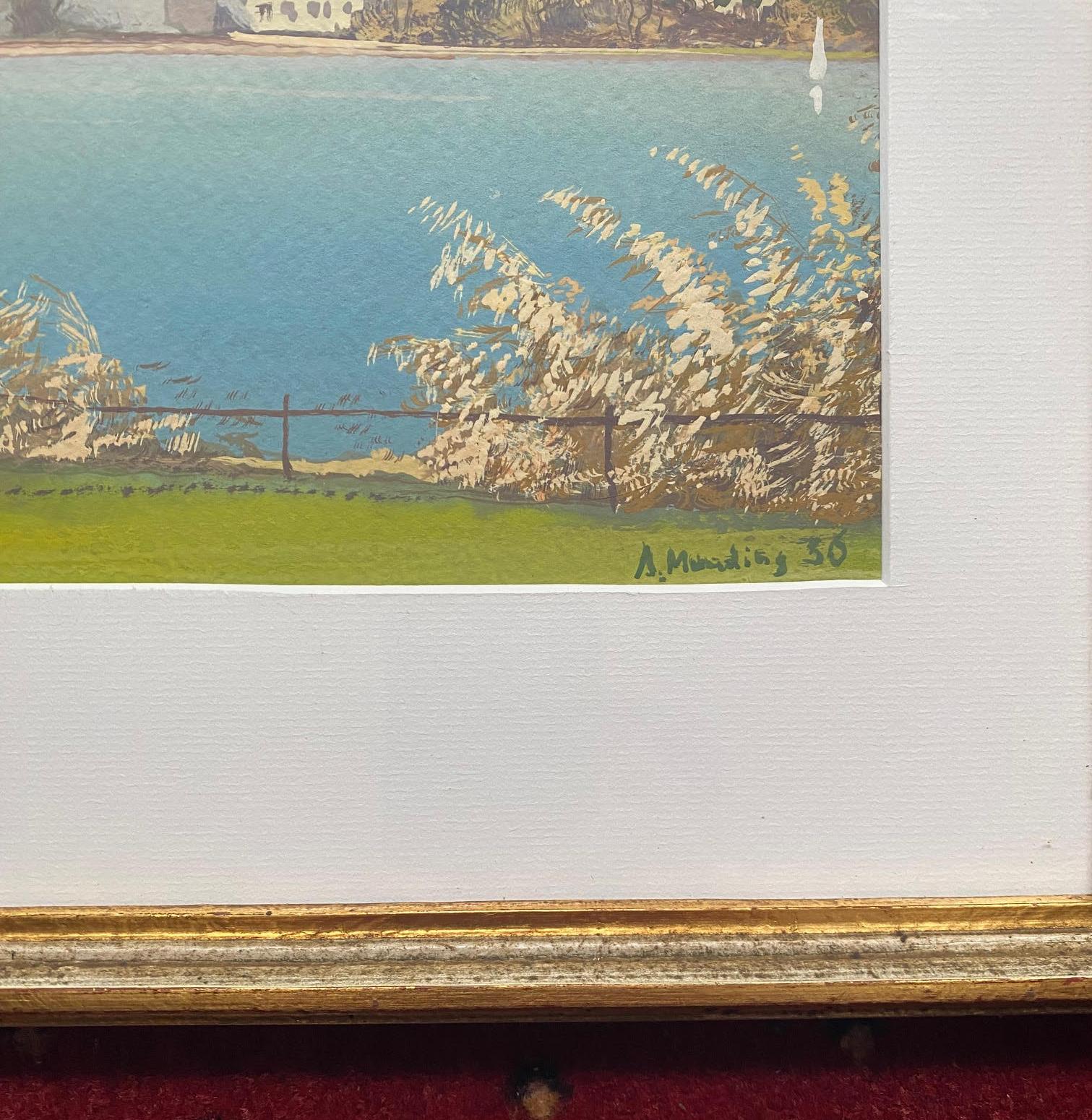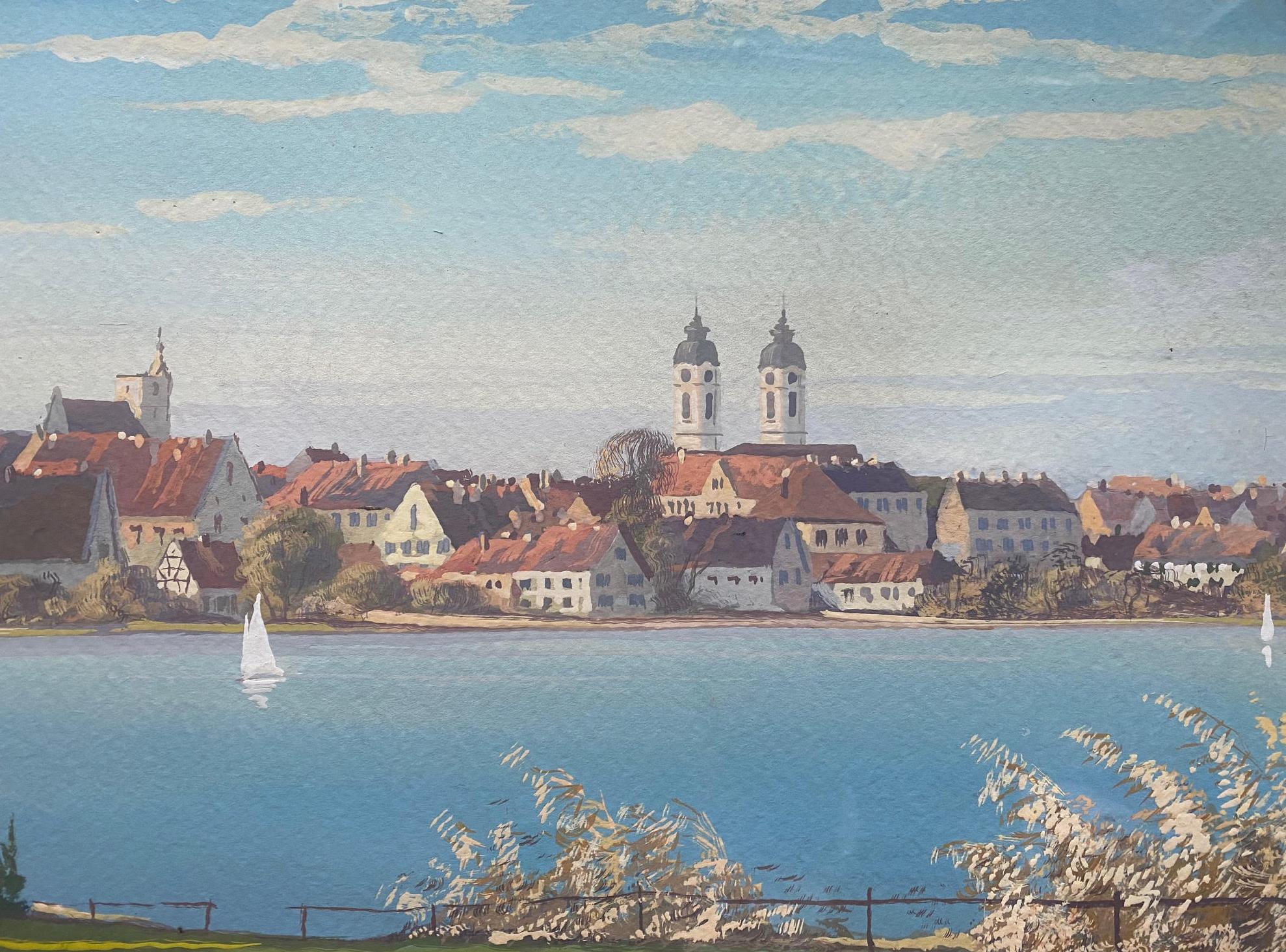 Münding, Anton (1903 – 1976): ‚Bad Waldsee‘ : Ansicht über den Stadtsee auf die Stadtkulisse : Gouache auf Papier, signiert und datiert. 1930. 34 x 47 cm, unter Passepartout wohnfertig gerahmt in Goldleiste 49 x 59 cm, Munding schuf rund 3000 Bilder, teils in Gouache-Technik, teils in Öl auf Leinwand. Seine Landschaftsmalereien zeigen Gegenden wie den Bregenzerwald, die Bodenseegegend um Nonnenhorn, das Pfrunger-Burgweiler Ried, das obere Donautal, die Schwäbische Alb und den Schwarzwald. Aufgrund seiner Vorliebe für Seen, Tümpel, Torfstiche und Biotope im Pfrunger-Burgweiler Ried wird Munding auch ‚Birkenanton‘ oder ‚Riedmaler‘ genannt.
