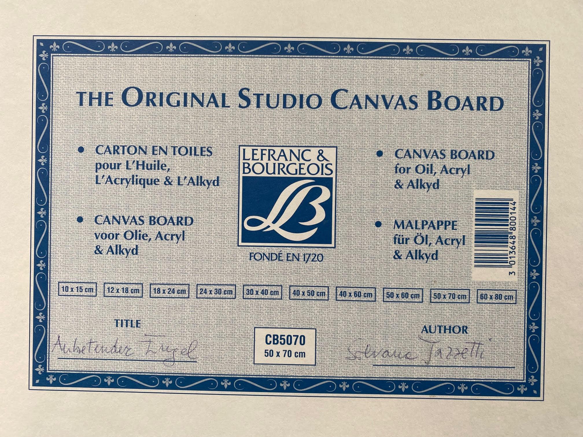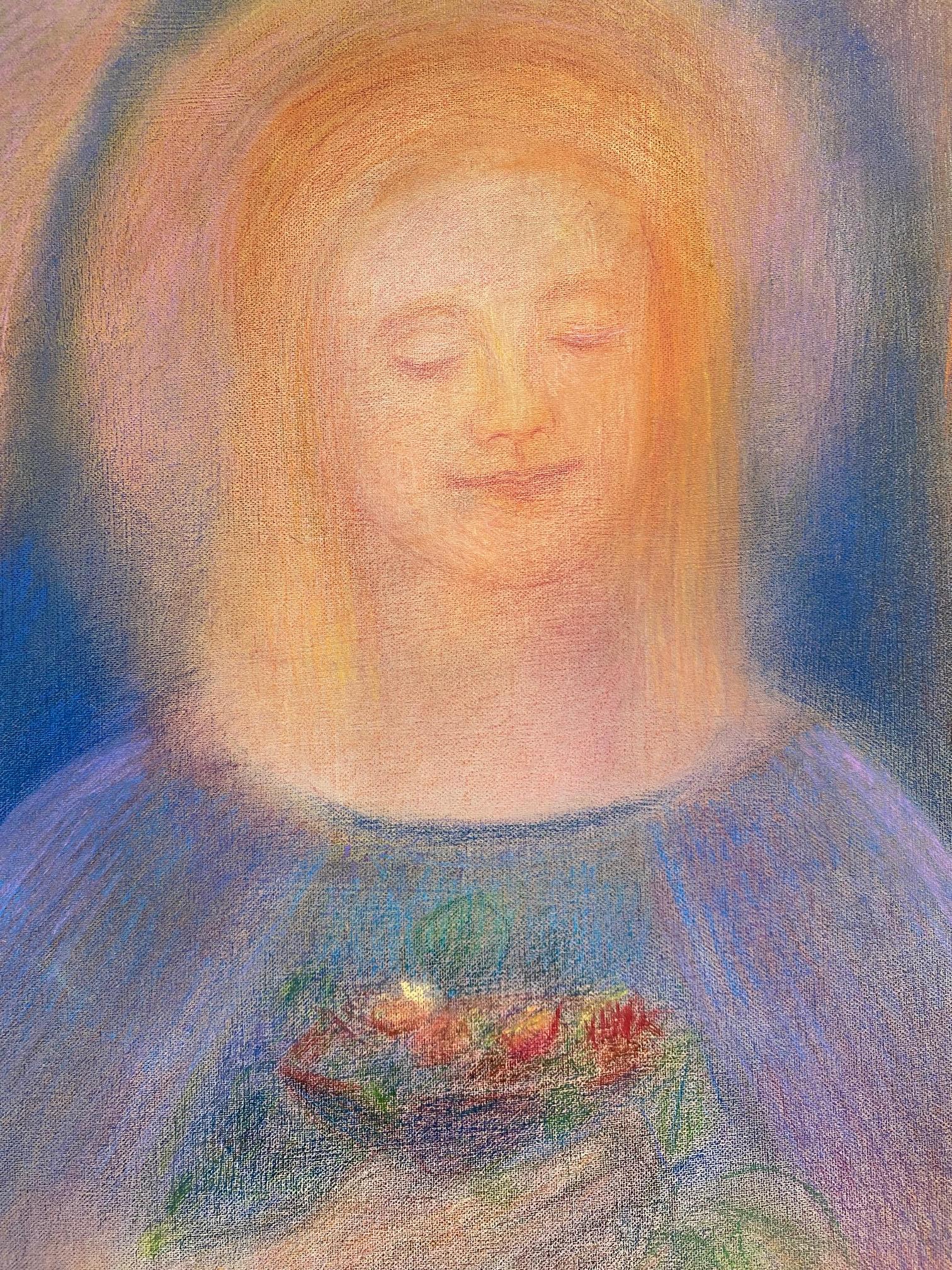 Jazzetti, Silvana (ca 1949 Rom – 2025 Illmensee): ‚Anbetender Engel‘ : Pastell auf Leinwand-Karton : rückseitig auf Klebezettel bezeichnet und signiert : [um 2000]. in Naturholzleiste 82 x 62 cm, Rahmen fußseitig etwas bestossen, Die anthroposophische Lehrerin, Künstlerin und Musikerin – geboren in Rom – fertigte zahlreiche Bilder im Stile von Odilon Redon, Rudolf Steiner und nach den Farbentheorien der Liane Collot d’Herbois; Ausstellungen in der Region.–
