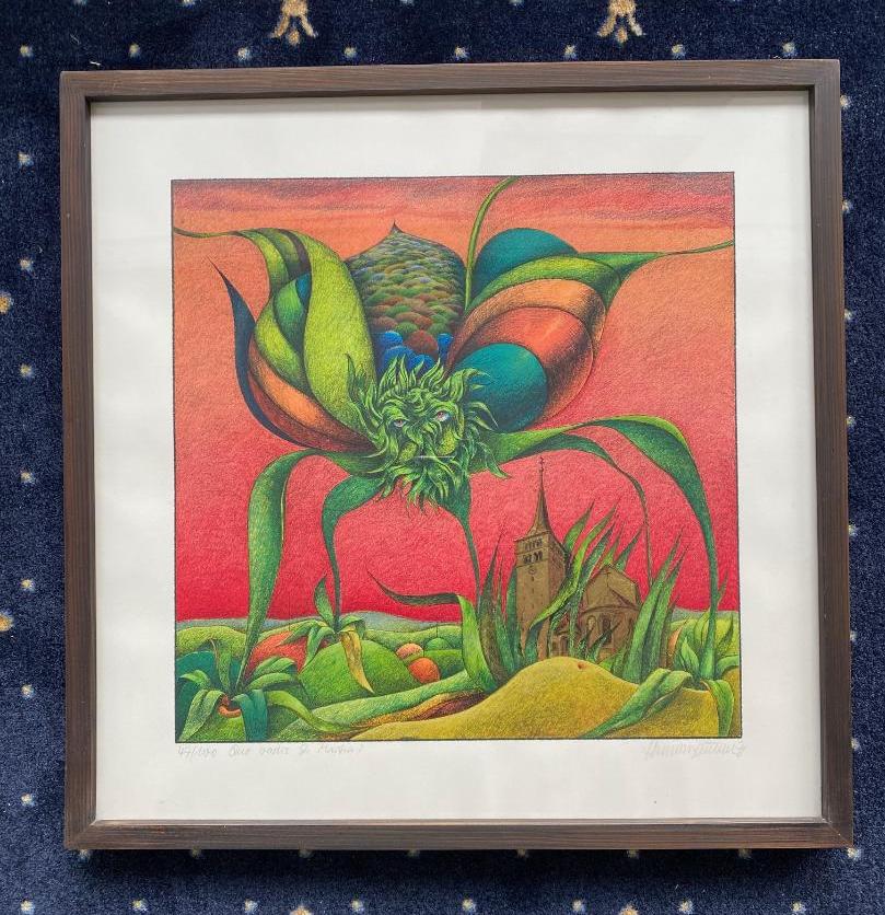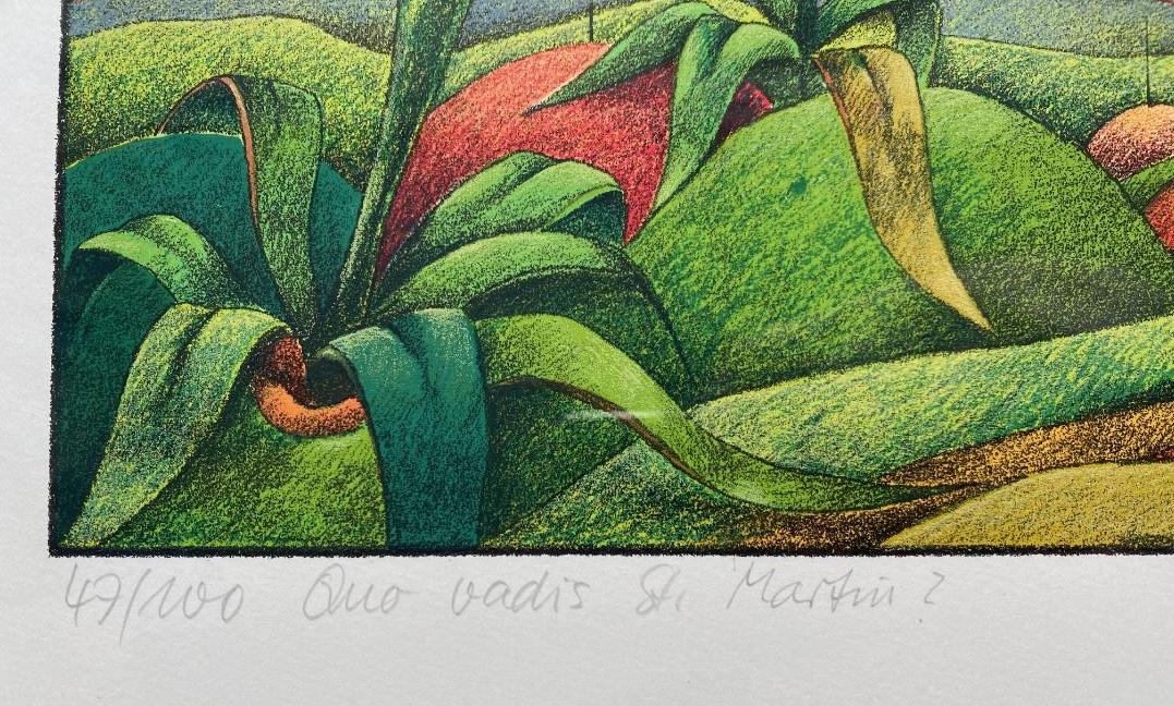 Bäurle, Hans (1931 – 2024). – ‚Quo vadis St. Martin‘ : Serigrafie farbig, teils goldgehöht : mit Bleistift numeriert 47/100, bezeichnet, handsigniert und datiert ’78, rückseitig Atelier-Stempel : 1978. Bildformat 42 x 42 cm, im Original Holz-Rahmen 58 x 58 cm wohnfertig gerahmt, Rahmen minimal bestossen, Der Künster lebte in Altdorf bei Böblingen.– 1953-58 Akademie der bildenden Künste, Stuttgart.–