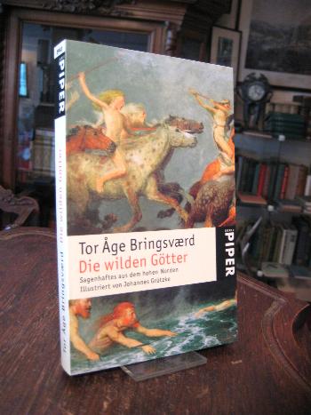 Andere Bibliothek 200. – Bringsvaerd, Tor Age: Die Wilden Götter : Sagenhaftes aus dem hohen Norden. Aus dem Norwegischen (Den enoyde : Et forsok pa a gi en fri og selvstendig, men likevel tro gengivelse av vare gamle norrone myter; 1996) von Tanaquil und Hans Magnus Enzensberger. Mit 77 Zeichnungen, Initialen und Vorsatz von Johannes Grützke. 1. Aufl. (1.-9. Tsd.), Frankfurt/M, Eichborn Verlag, 2001. 8° (22x13), 307, (1) S., 2 Bl., goldener Oln gewachst mit Blindprägung, mit Rückenschild, Sprenkelschnitt, Lesebändchen, mit ill Umschlagstreifen, ohne Gebrauchsspuren, wohl ungelesen, [= Die Andere Bibliothek; 200 : herausgegeben von Hans Magnus Enzensberger], nummeriertes Exemplar 6545.–