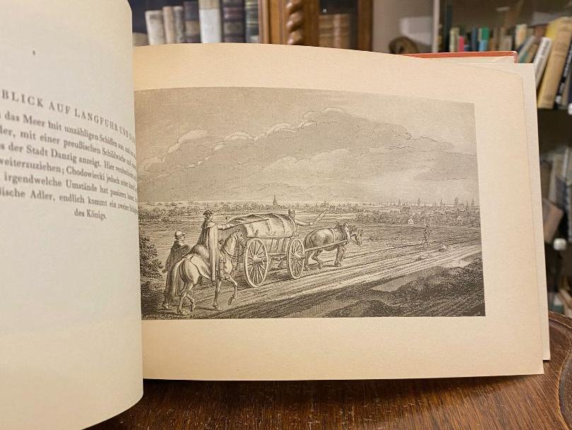 Chodowiecki, Daniel (1726-1801). – Oettingen, Wolfgang von: Daniel von Chodowiecki – Von Berlin nach Danzig : Eine Künstlerfahrt im Jahre 1773. 108 Lichtdrucke nach den Oritinalen in der Stattl. Akademie der Künste in Berlin, mit erläuterndem Text und einer Einführung von Wolfgang von Oettingen. (1. Aufl.), Leipzig, Insel-Verlag, 1923. 4°quer (16x25), [95] S., mit fotograf Aufnahmen und 85 Bildtafeln mit 108 Lichtdrucken nach Feder- und Tuschzeichnungen, OPbd mit feiner Prägung, mit mont Titelschild, goldRPräg, dreiseitiger grünSchnitt, Rücken und rückseitig lichtverfärbt, sonst sauber und wohlerhalten, [Sarkowski Insel², 309].–