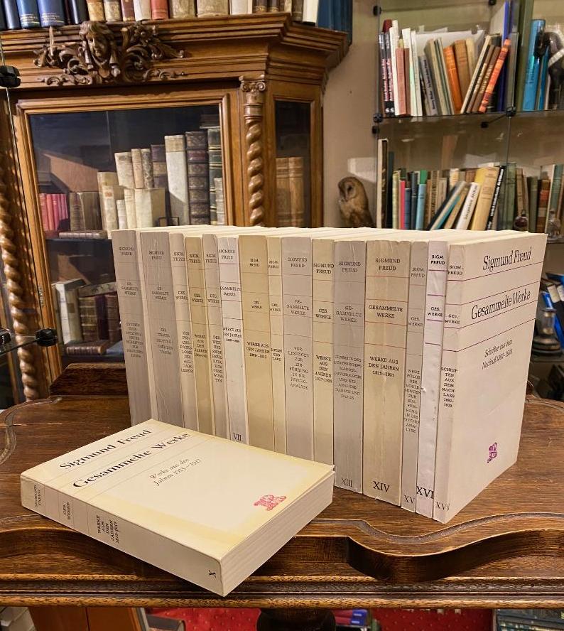 Freud, Sigmund (1856-1939). – Freud, Anna (Hrsg): Sigmund Freud – Gesammelte Werke : Chronologisch geordnet [in 17 Bänden ohne das Gesamtregister]. Unter Mitwirkung von Marie Bonaparte, Prinzessin von Griechenland. [Photomechanischer Raubdruck der Ausgabe London, Imago]. 17 Bände in 16 Bänden (von 18), [Coimbatore], Lingam Press, [um 1970]. 8° (20x24), VII, 594,[8]; XV,724,[5]; 322,[8]; 332,[7]; 285,[8]; 496; 502,[8]; 206,[7]; 481,[7]; 497,[9]; 354,[8]; 477,[9]; 605,[9]; 208,[4]; 296; 161,[9] S., OKart (Brosch), Einbände unteschiedlich leicht lichtverfärbt. die letzten 2 Bände etwas angetaubt/leicht unfrisch, sonst sauber und ordentlich mit geringen Lesespuren, Bandeinteilung: BAND I: Werke aus den Jahren 1892 – 1899.– BAND II/III: Die Traumdeutung.– Über den Traum.– BAND IV: Zur Psychopathologie des Alltagslebens.– BAND V: Werke aus den Jahren 1904 – 1905.– BAND VI: Der Witz und seine Beziehung zum Unbewussten.– BAND VII: Werke aus den Jahren 1906 – 1909.– BAND VIII: Werke 1909 – 1913.– BAND IX: Totem und Tabu.– BAND X: Werke aus den Jahren 1913 – 1917.– BAND XI: Vorlesungen zur Einführung in die Psychoanalyse.– XII: Werke aus den Jahre 1917 – 1920.– BAND XIII: [1920-1924] Jenseits des Lustprinzips.– Massenpsychologie und Ich-Analyse.– Das Ich und das Es.– BAND XIV: Werke aus den Jahren 1925 – 1931.– BAND XV: [1932] Neue Folge der Vorlesungen zur Einführung in die Psychoanalyse.– BAND XVI: Werke aus den Jahren 1932 – 1939.– BAND XVII: Schriften aus dem Nachlass 1892 – 1939.— jeweils mit Register am Ende des Buches, aber ohne den Registerband.–