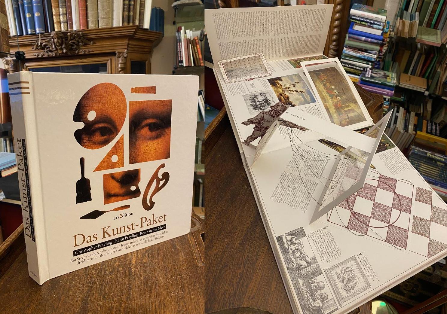van der Meer, Ron / Frayling, Christopher / Frayling, Helen: Das Kunst-Paket : Ein Streifzug durch die bildende Kunst mit einleuchtenden Beispielen, dreidimensionalen Bildern und vielerlei erstaunlichen Effekten. München, Ars Edition, (1993). 4° (29x29), 9 Doppelseiten mit Kulissen, die sich beim Aufstellen öffnen, verschiedenste Zieh- und Dreh-Mechanismen, Beilagen, teils zusätzlich nochmals aufklappbar und auch hier mechanische Teile, in 3 Fächern des Rückendeckels Audio-CD, Hefte, Kleinteile, [so komplett], ill OPbd, hintere Rückenkante etwas berieben, kaum genutzt, Teile teils originalverpackt, schönes gepflegtes Exemplar, Wieder ein Meisterwerk des mit vielen Preisen ausgezeichneten Künstlers Ron van der Meer, der sich auf ‚paper engineering‘ – den Entwurf und die Realisierung dieser Art mechanischer Bücher – spezialisiert hat.–