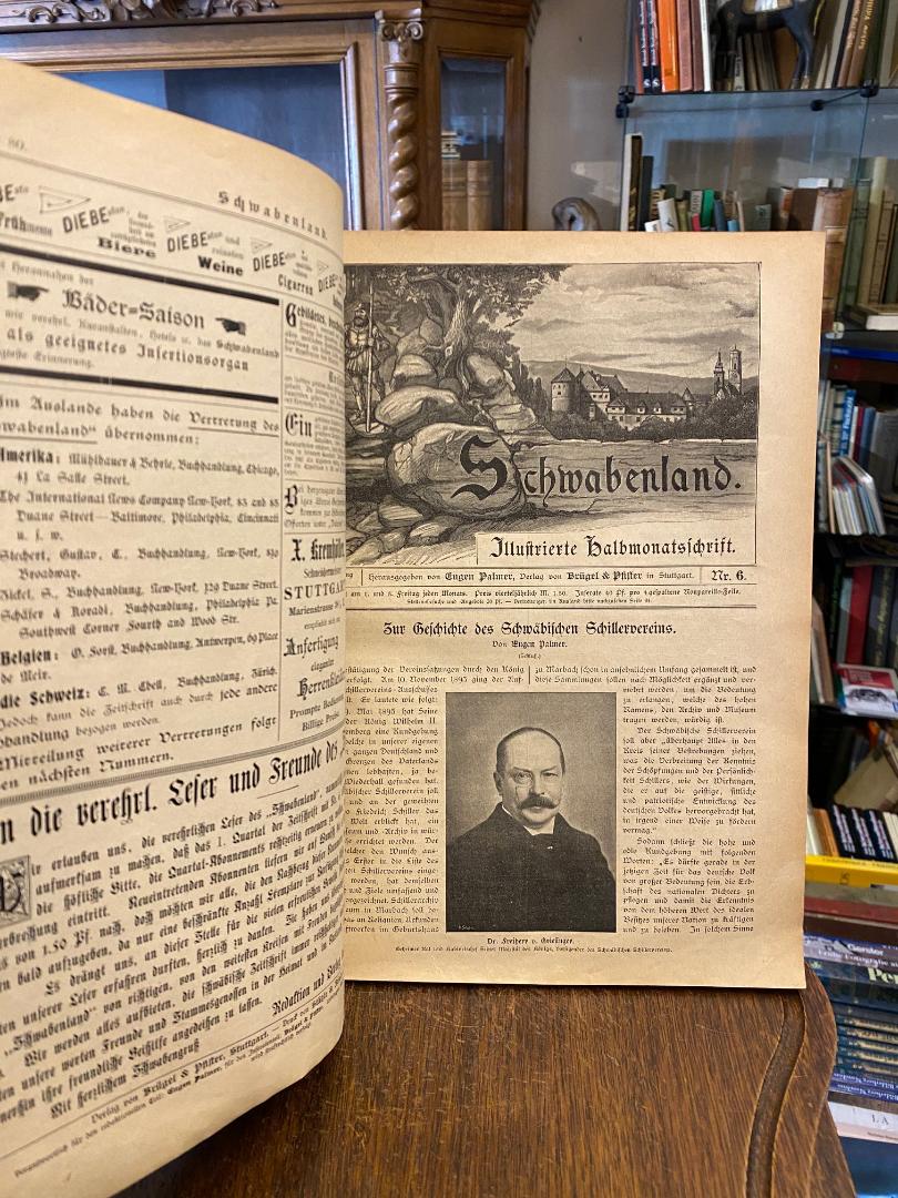 Palmer, Eugen: Schwabenland : Jahrgang 1897 : Illustrierte Halbmonatsschrift, zugleich Organ für Schwaben-Vereine Deutschlands und des Auslands. Stuttgart, Verlag von Brügel & Pfister, 1897. 4° (31x23), 1 Bl., 296 S., marmor HartBrosch d.Zt., Archivstempel auf Innenspiegel/Titel, Besitzvermerk Oberrealschule Ravensburg, 1 kleiner Eckabriss, gelegentlicher Eckknick, ordentliches festes Exemplar, [= Schwabenland : Illustrierte Halbmonatsschrift; Jg. 1 (1897) : Eerscheinungsweise nachgewiesen 1897 – 1899 (alles?)], enthält Nr. 1 – 18, kein Jahresregister.–