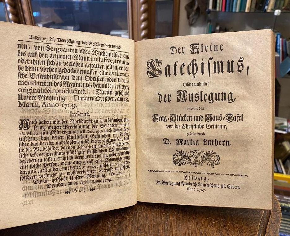 Agenda, Das ist: Kirchen-Ordnung, Wie sich die Pfarrherren und Seelsorger in ihren Aemtern und Diensten verhalten sollen. Für die Diener der Kirchen in Hertzog Heinrichs zu Sachsen, U.G.H. Fürstenthum gestelltet. Jetzo aufs neue aus Churfürst Augusti Kirchen-ordnung gebessert, auch mit vielen Collecten der Superintendenten, wie nicht weniger mit selbigen auf alle Wochen- Sonn- und Fest-Tage vermehret. [angebunden] Der kleine Katechismus, ohne und mit der Auslegung nebenst den Frag-Stücken und Haus-Tafel vor die Christliche Gemeine, gestellet durch D. Martin Luthern. Leipzig, Friedrich Lankisch, 1747. Leipzig, bey Friedrich Lanckischens Erben, 1748. 8° (21x17), 5 Bl., 258 S., 4 Bl.; 4 Bl., 56 S., (Katechismus) 6 Bl. (Kirchengebete), 40 S. (Eheordnung), mit mehreren Holzschnitt-Vignetten und mehreren Seiten Noten, roter Samteinband, dreiseitiger Goldschnitt, Kleisterpapier-Vorsätze, obKapital minimal verletzt, kaum genutzt, sauber und gepflegt, auf flVorsatz handschriftlicher Eintrag: ‚Diese Agenda habe ich beim Abbruch der alten Peterskirche [Leipzig] 1885 gerettet / wo die übrigen hingekommen sind ist mir nicht bekannt, denn es lag alles in Schutt und Trümmer, im Gebrauch bei den Gottesdiensten meiner Zeit ist sie nie gekommen. Alle die alten Bücher lagen über der Kanzel in einem finsteren Loch. A. Schmidt‘