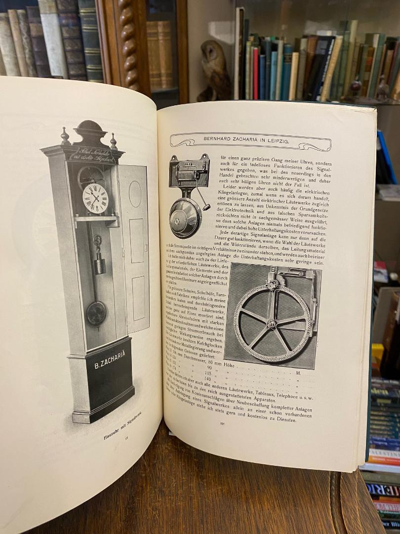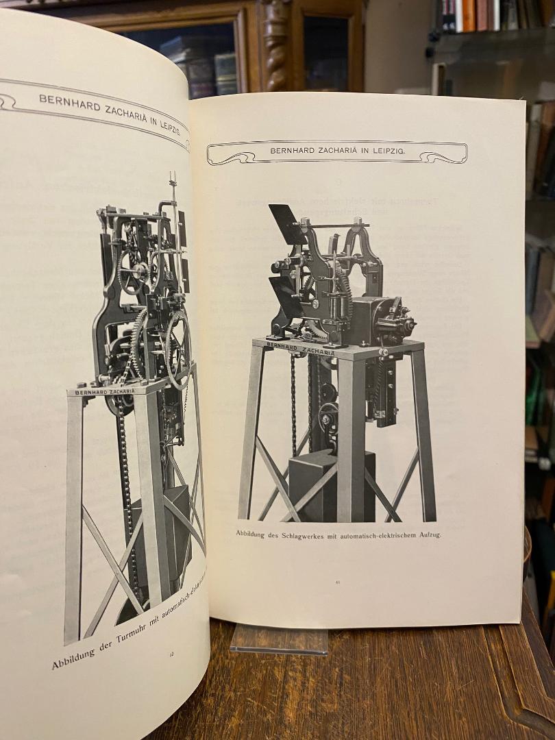 Zachariä, Bernhard : Leipzig (Hrsg): Firma Bernhard Zachariä, Leipizig (Fabrik, Comptoir und Lager: Wiesenstr. 10) : [Katalog] Preis-Liste über Turm-Uhren, Elektrische Uhren und Kontroll-Uhren : Ausgabe No. 16 März 1905. Leipzig, Bernhard Zachariä, März 1905. 4° (28x19), 2 Bl., 135 S., mit zahlr. Abb., teils auf eingefalteten Tafeln, mit Preisangaben, OKart (Brosch) mit Jugendstil-Illustration und TitelPrägung auf Deckel, die letzten Blatt mit minimalem Fleckchen in der oberen Ecke, kaum genutzt, sehr schönes und gepflegtes Exemplar,