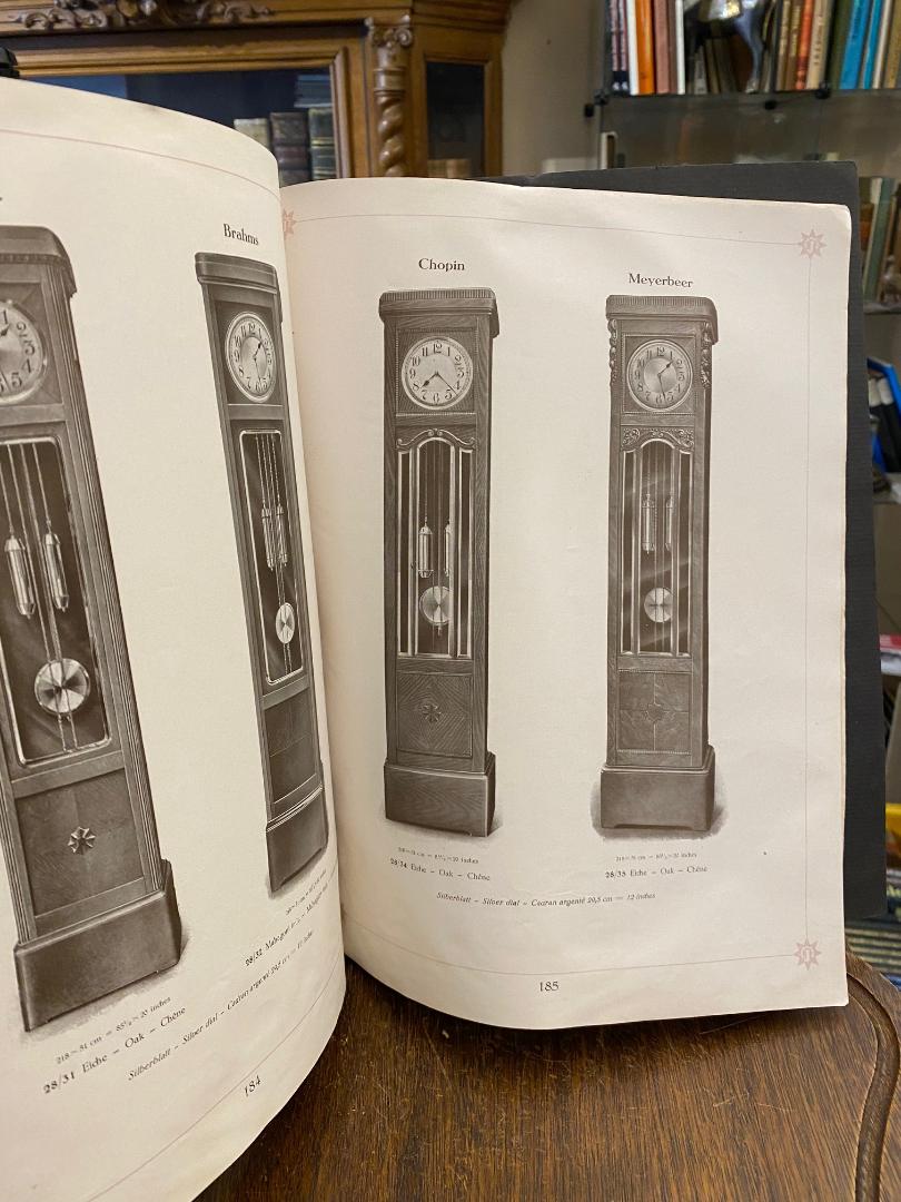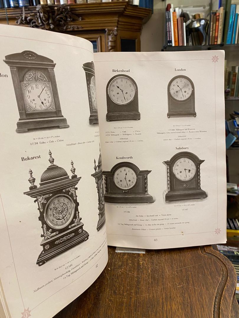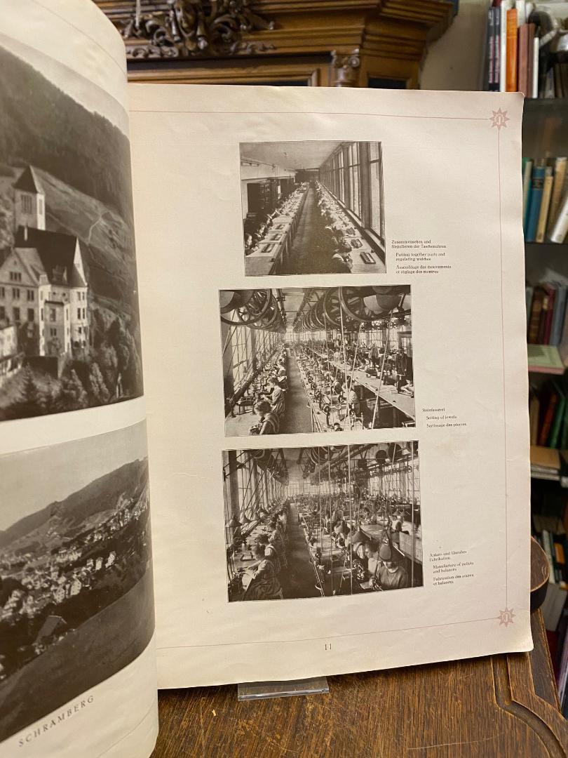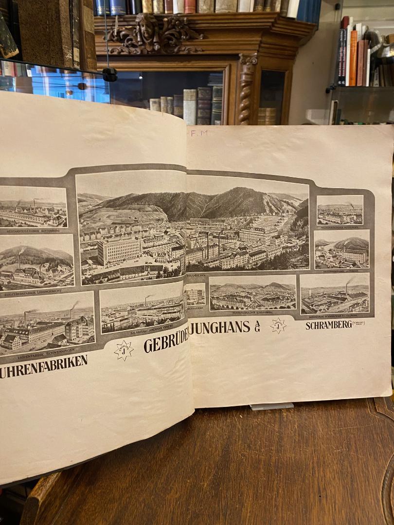 Junghans, Gebrüder : Schramberg (Hrsg): Uhrenfabriken Gebrüder Junghans, Schramberg : [Katalog] 1923. Schramberg, Gebrüder Junghans, 1923. 4° (33x16), 216 S., doppelseite Sammelansicht, Nummern- sowie Namensverzeichnis, je Kapitel Fabrikationsstätten-Bilder, sowie unzählige Abb. von Uhren, schwarzer OKart (Brosch) mit farb Titeldruck, Rücken minimal verletzt, Innenspiegel mit einmontierter Sammelmarke zum Thema, Titelblatt mit Eckknitter, anfangs minmal fingerfleckig, sonst schönes gepflegtes Exemplar, dreisprachige Ausgabe deutsch englisch französisch.–