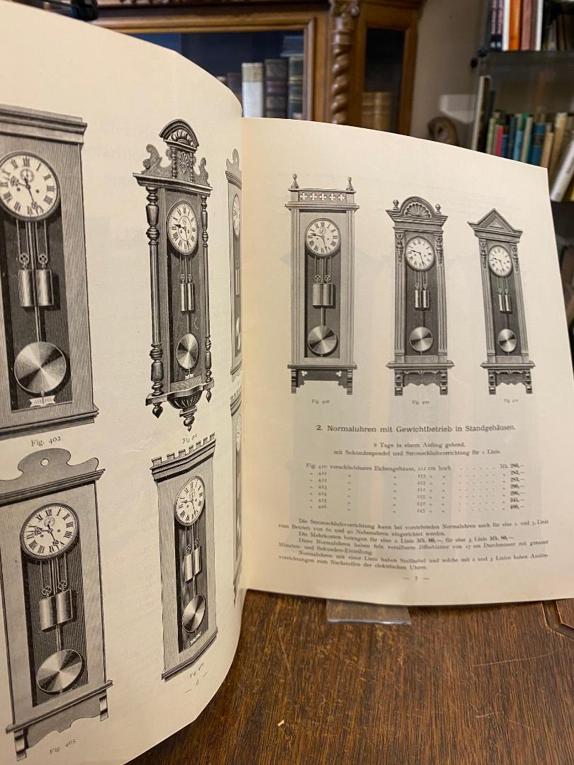 Bohmeyer, C : Halle a. S. (Hrsg): C. Bohmeyer : Fabrik elektrischer Uhren und Apparate : [Katalog] : Preis-Liste über Normaluhren, elektrische Nebenuhren, elektrische Schlagwerkeinrichtungen, elektrische Wächterkontrolluhren, Nebenapparate etc. Halle a. S., C. Bohmeyer / Erhardt Karras (Druck), (1907). 4° (29x23), 55 S., mit zahlr. Abb. von Wand- und Standuhren, Auslegern, freistehenden Aussenuhren, Schlagwerken, Nebenapparaten, Schaltpläne im Anhang, OKart (Brosch) mit Titeldruck, schwache Mittelfalte, sauber und wohlerhalten,