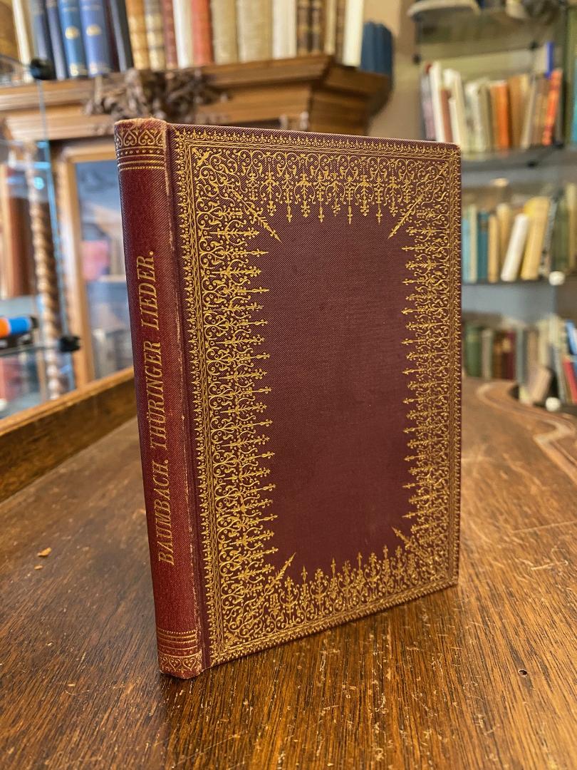 Baumbach, Rudolf: Thüringer Lieder. 5. Tsd., Leipzig, Verlag von A. G. Liebeskind, 1891. 12° (15x10), V, 142 S., 1 Bl., roter Oln mit reicher Goldprägung, dreiseitiger Goldschnitt, SchmuckVorsätze, minimal berieben, Name auf Titelblatt, gutes Exemplar,