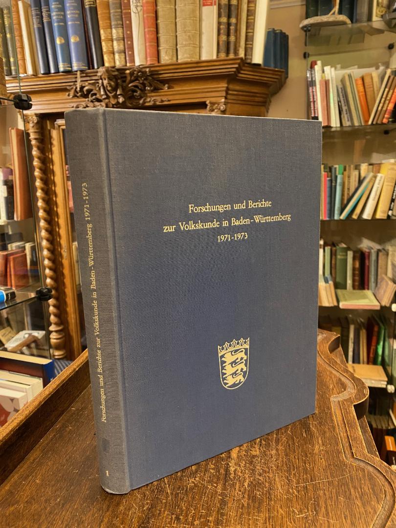 Hampp, Irmgard / Assion, Peter: Forschungen und Berichte zur Volkskunde in Baden-Württemberg 1971 – 1973. Stuttgart, Kommissionsverlag Verlag Müller & Gräff, 1973. 4° (30x21), 309, [28] S., mit 55 Abb. auf Kunstdrucktafeln im Anhang, Oln mit TitelPrägung ohne OU, gering angestaubt, sehr vereinzelte Farbmarkierungen, [= Landesdenkmalamt Baden-Württemberg : Forschungen und Berichte zur Volkskunde in Baden-Württemberg; 1], enthält folgende Aufsätze: Martin Scharte: Deutsche Bilderbogen für Jung und Alt : Anmerkungen zum Inhalt eines Massenmediums im 19. Jahrhundert (Abb. 1-15).– Jürgen Leibbrand: Armenseelenkult und Andachtsgraphik im 19. und 20. Jahr hundert (Abb. 16-27).– Peter Assion: Ein Kult entsteht : Untersuchungen zur Verehrung der Ulrika Nisch von Hegne am Bodensee (Abb. 28-31).– Dieter Kauß: Volkskundliche Erwägungen zur Ausstattung der Hofkapelle in Vogtsbauernhofmuseum in Gutach im Kinzigtal.– Elke Schwedt: Kunst und Kreativität in einer ländlichen Gemeinde (Abb. 32-43).– Herbert Schwedt: Zum informellen Namensystem einer württembergischer Landgemeinde.– Ernst Hirsch: Die Herkunft unserer Waldenser.– Ernst Hirsch: Der Aberglaube vom guten und vom bösen Blute in den Waldenserdörfern.– Ernst Hirsch: Die Waldenser und die Einführung der Kartoffel in Württemberg.– Martin Wissner: Die Pfarramtlichen Gesang-Berichte : Ein Beitrag zur Entstehung der Gesangvereine im 19. Jahrhundert.– Angelika Bischoff-Luithlen: Bräuche, Lebensformen und Rechtsverordnungen in Altwürttemberg.– Dietz-Rüdiger Moser / Hartmut Braun: Liedimmanenz und Brauchgeschichte : Beiträge zur Frühgeschichte des Sternsingens: I. Die Legende von den hl. drei Königen im brauchtümlichen Liedgut des 16. Jahrhunderts (Moser) / II. Alte Formeln in Melodien des Sternsingerbrauches und ihr Weiterleben (Braun).– Lenz Kriss-Rettenbeck: Spiritualität. Rationalität und Sensualität : Zu dem Buch ‚Evangelische Andachtsbilder‘ von Martin Scharfe.– Martin Scharfe: Einige Anmerkungen zu Lenz Kriss-Rettenbecks Rezension.– Wolfgang Mieder: Das Sprichwort in Johann Peter Hebels ‚Schatzkästlein des Rheinischen Hausfreundes‘.– Hartmut Braun: Der Schäppel und sein kulturgeschichtlicher Ursprung (Abb. 44-49).– Heiner Heimberger: Alte Wiesenwässerungsanlagen im Bauland und Odenwald (Abb. 50-51).– Werner Lipp: Schwäbische Backhäuser (Abb. 52-55).– Robert Hensle: Das Backhaus im bäuerlichen Betrieb des oberen Erftales (Bauland).– Gerhard König-Kurowski: Konflikte und Konfliktlösungen in Science-Fiction Romanen : Ein Beitrag zur Analyse von Gesellschaftsvorstellungen in de Trivialliteratur.– Gottfried Korff / Utz Jeggle / Ulrich Ammon: Unterhausen (Kreis Reutlingen) : Volkskundlich-soziologische Beobachtungen an einer alten Siedlung: Die Spinnereisiedlung (Korff) / Die Kinder der Gastarbeiter (Jeggle, Löbs, Hänel) / Zur Sprache der Arbeiter in Unterhausen (Ammon).— dazu Bibliographien, Arbekitsberichte, Nachrufe und Buchbesprechungen.–