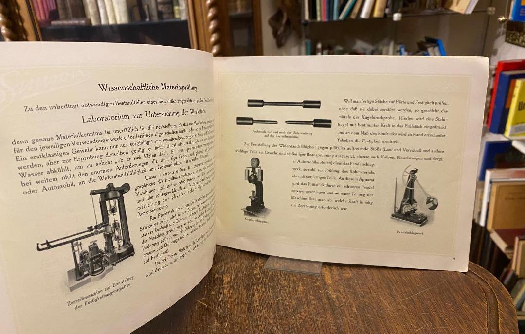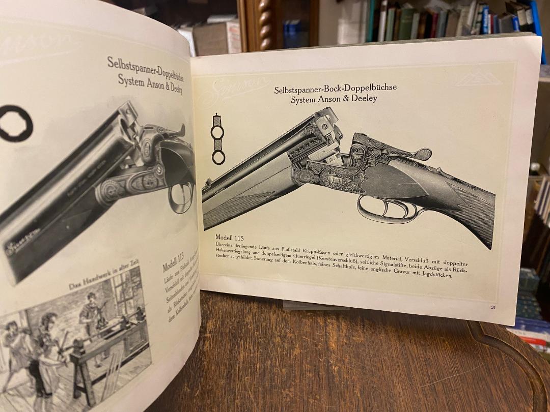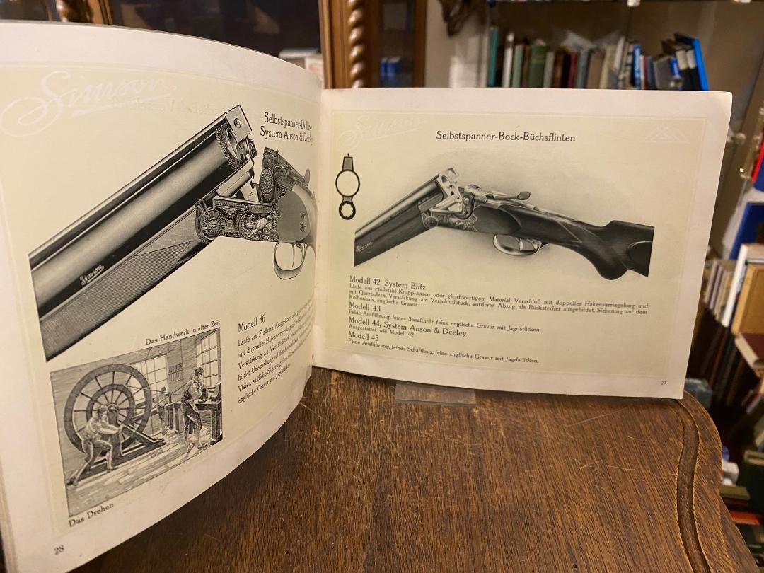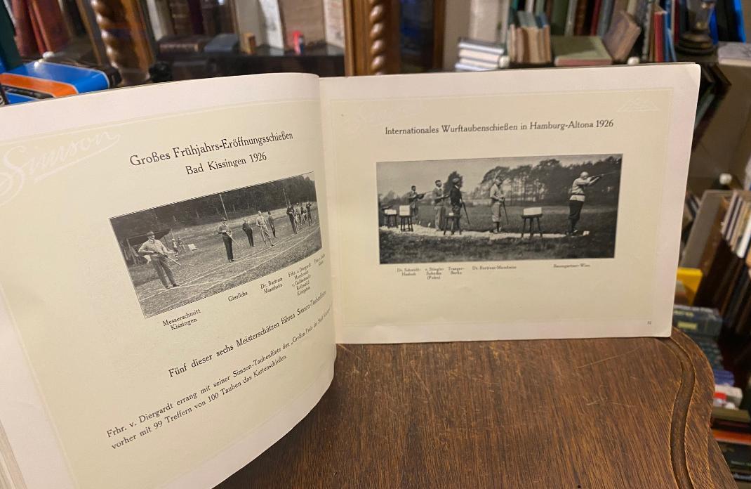 Simson & Co : Suhl i. Thür. : Waffenfabriken (Hrsg): (Katalog der Sonderabteilung für Jagd- und Sportgewehre). (Mit Vorwort von E. Edler von Resch). (1. Aufl.), Suhl in Thüringen, Simson & Co : Fabriken für Automobile, Fahrräder, Jagdgewehre, Waffen,, feinmechanische Instrumente, Kleinmaschinen / Saalfeld (Saale), Wiedemann’sche Druckerei (Druck), [um 1927]. 4°quer (19x25), 2 Bl. (Grafik & Firmeninformation) + 56 S., Titel rückseitig mit Verkehrskarte, mit zahlr. Abb. von Gewehren, graph. Darst., Begleitinformationen zu Munition, Materialprüfung, mechanische und chemische Prüfung etc., OKart (Brosch) mit Deckel-Illustration und Titeldruck in GoldRelief, minimal angestaubt, fest und sauber, wohlerhalten,