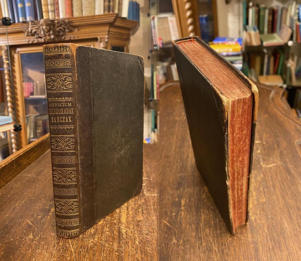 Officium Majoris Hebdomadae a Dominica in Palmis usque ad Sabbatum in Albis : juxta ordinem Breviarii, Missalis et ontificalis Romani cum Cantu ex editionibus authenticis quas curavit Sacrorum Rituum Congregatio. Regensburg u.a., Friedrich Pustet, 1893. 8° (19x13), 436 S., rot-schwarz Druck; rot rubriziert, gregorianische Notation, brauner OHldr mit reicher goldRückenPrägung, Rotschnitt, SchmuckVorsätze, Ecken berieben, Namen-Rundstempel auf Vorsat (Pfarrer Anton Hettler), Papier gebräunt, teils deutlich begriffen, ordentliches festes Exemplar,