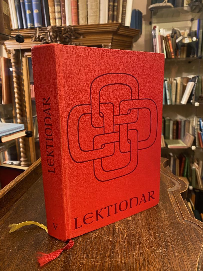 Die Feier der Heiligen Messe : Lektionar: Band V : Die Schriftlesungen für die Gedenktage der Heiligen. Einsiedeln und Köln, Benziger / Freiburg und Basel, Herder / Regensburg, Friedrich Pustet / Wien, Herder / Salzburg, St. Peter / Linz, Veritas, 1975. 4° (26x18), 580 S., 1 Bl., mit Erratazettel, roter OKldr mit Prägung, 2 Lesebändchen, Schnitt etwas angestaubt, Stempel auf Vorsatz fest sauber und gepflegt, [= Lektionar V : herausgegeben im Auftrag der Bischofskonferenzen Deutschlands, Österreichs und der Schweiz und des Bischofs von Luxemburg], In der von Alfred Riedel gestalteten Adamas Antiqua.–