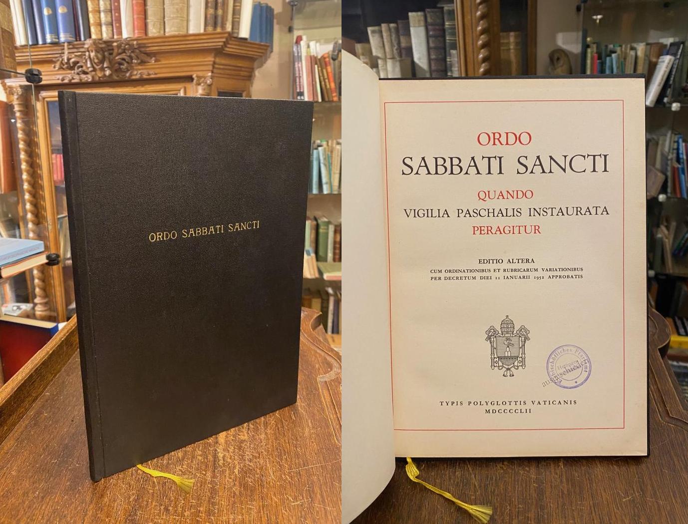 Ordo Sabbati Sancti Quando Vigilia Paschalis Instaurata Peragitur : Editio Altera cum Ordinationibus et Rubricarum Variationibus per Decretum Diei 11 Januarii 1952 approbatis. Rom, Typis Polyglottis Vaticnis, 1952. 4° (29x21), 44 S., 1 Bl., rot rubriziert, schwarzer Oln gewachst mit goldTitel, Lesebändchen, Stempel auf Vorsatz/Titel, schönes gepflegtes Exemplar, Der Begriff Ordo Sabbati Sancti bezeichnet die liturgische Ordnung für den Karsamstag, insbesondere die Feier der Osternacht (Vigilia Paschalis). Historisch gesehen ist der Titel eng mit der Liturgiereform unter Papst Pius XII. verbunden. Im Jahr 1951 wurde das ‚Ordo Sabbati Sancti Quando Vigilia Paschalis Instaurata Peragitur‘ veröffentlicht, hier vorliegend in der ergänzten Fassung 1952. Es markierte die ‚Wiederherstellung‘ der Osternacht, die zuvor oft am Karsamstagmorgen gefeiert worden war, und legte deren Feier wieder in die Nachtstunden fest.– Die Ablauf gliedert sich nach diesem Ordo in 4 Teile: 1. Die Lichtfeier (Licernarium).– 2. Wortgottesdienst.– 3. Taufliturgie.– 4. Eucharistiefeier.–