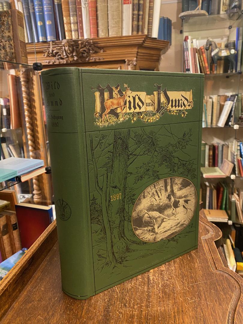 Wild und Hund 1897 – Jahrgang 3 : REPRINT der Ausgabe Berlin, Verlag Paul Parey, 1897. Hamburg, Paul Parey Zeitschriftenverlag, 1996. 4° (32x23), VIII, 847 S., mit 442 TextAbb. und 29 teils doppelseitige Kunstbeilagen, grüner Oln gewachst mit geprägtem Deckelbild, nahezu ungelesen, schönes gepflegtes Exemplar, enthält alle 53 Jahreshefte, durch Register erschlossen.–