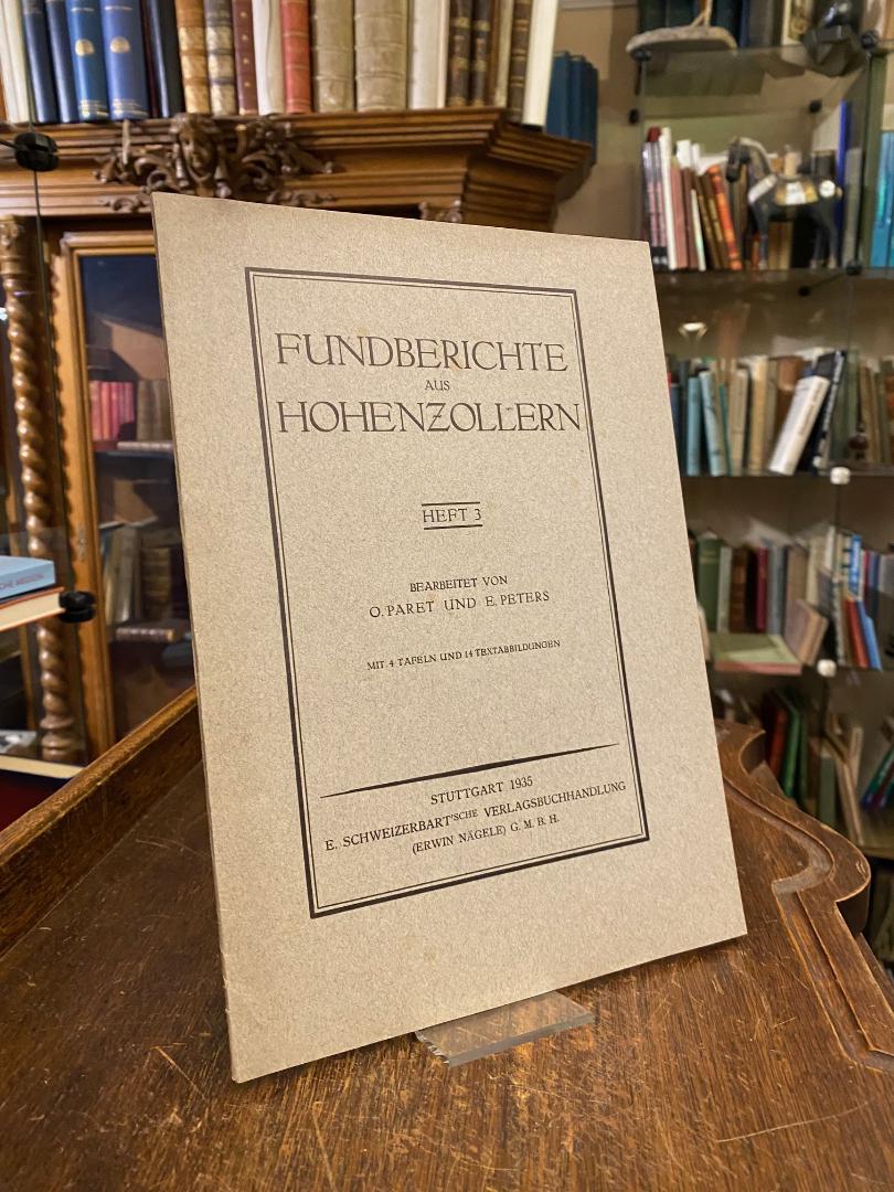 Fundberichte aus Hohenzollern : Heft 3 : Anhang II der Fundberichte aus Schwaben NF VIII : Bearbeitet von Oskar Paret und Eduard Peters. Stuttgart, E. Schweizerbart’sche Verlagshandlung (Erwin Nägele), 1935. 4° (27x19), 23 S., + 4 Tafeln, OKart (Brosch), sauber und wohlerhalten,