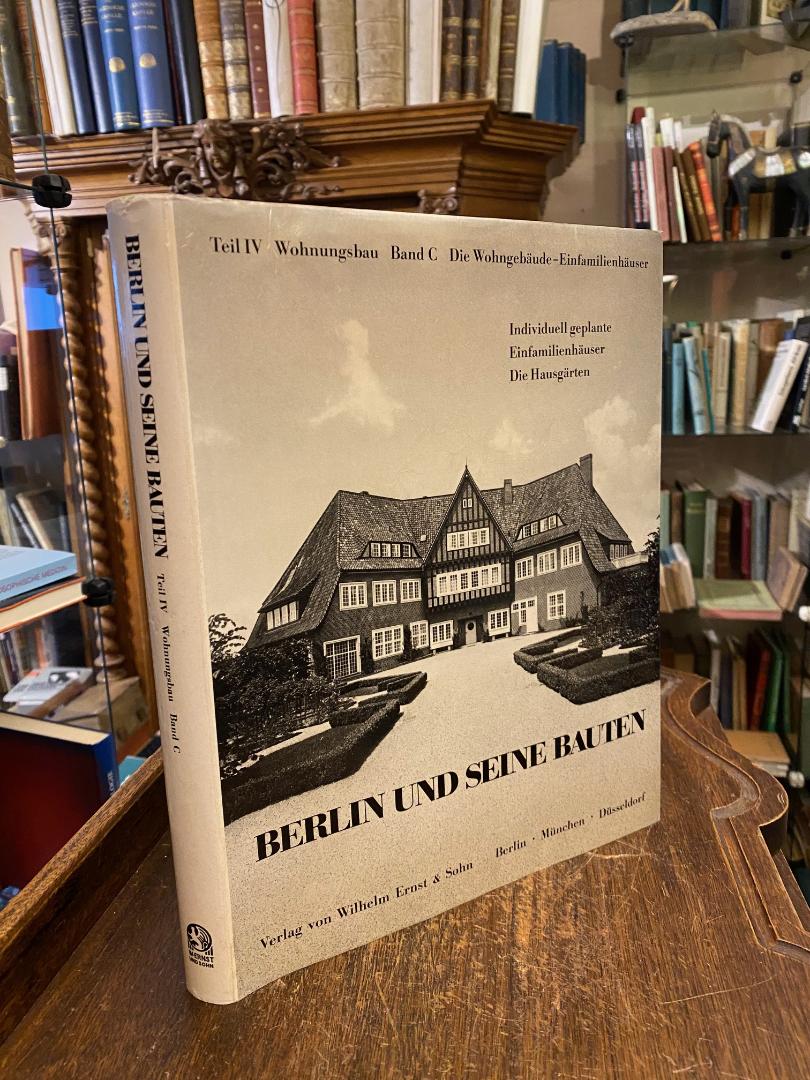 Berlin und seine Bauten : Teil IV: Wohnungsbau : Band C: Die Wohngebäude – Einfamilienhäuser – Individuell geplante Einfamilienhäuser – Die Hausgärten. Berlin; München, Düsseldorf, Verlag von Wilhelm Ernst & Sohn, 1975. 4° (30x24), IX, 421 S., mit 237 fotograf Aufnahmen und Grundrissen, 3 eingefaltete Pläne, Erratazettel, OPbd mit fotoill OU, Umschlag gering gealtert, Sinnspruch auf Vorsatz, gutes Exemplar, [= Berlin und seine Bauten; IV C : herausgegeben vom Architekten- und Ingenieur-Verein zu Berlin : Schriftleitung: D. Rentschler und W. Schirmer],
