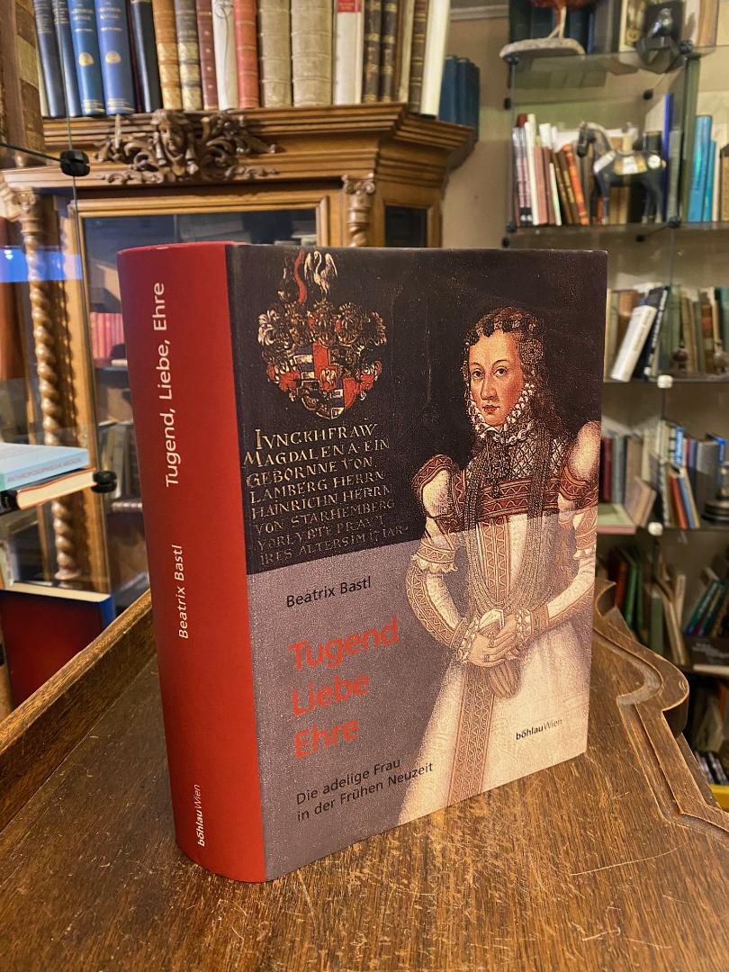 Bastl, Beatrix: Tugend, Liebe, Ehre : Die adelige Frau in der frühen Neuzeit. Wien; Köln; Weimar, Böhlau Verlag, (2000). 4° (25x18), 680 S., 1 Bl., mit TextAbb. und 32 farb Tafeln, WappenVorsätze, Oln mit ill OU, ohne Gebrauchsspuren, wohl ungelesen, frisch, Adelige Frauen hatten einen sozialen Sinn für Verträglichkeiten und Unverträglichkeiten innerhalb eines Systems von Zeichen, die jeder menschliche Körper an sich hat: Kleidung, Schmuck, Sprache, Haltung, Verhalten beim Essen, im Schlafzimmer, gegenüber den Kindern und Verwandten, bei der Liebe zwischen Mann und Frau. Aus diesem Grund finden sich innerhalb dieses Bandes auch Kochrezepte, Potenzmittel, Speisefolgen und Geschirr, da Nahrung und Ernährung mehr darstellen als ein biochemisches Problem; weiters Anleitungen zur Empfängnis und Geburt, dem Zusammenhang zwischen Stillen, Geburtenhäufigkeit und Kindertod, zu der Bedeutung von Gesten wie Handschlag, Kuß, Ringwechsel, Bett-besteigung und Benennung von Kindern. Man sieht es: Geschichte ist kein Text allein.–
