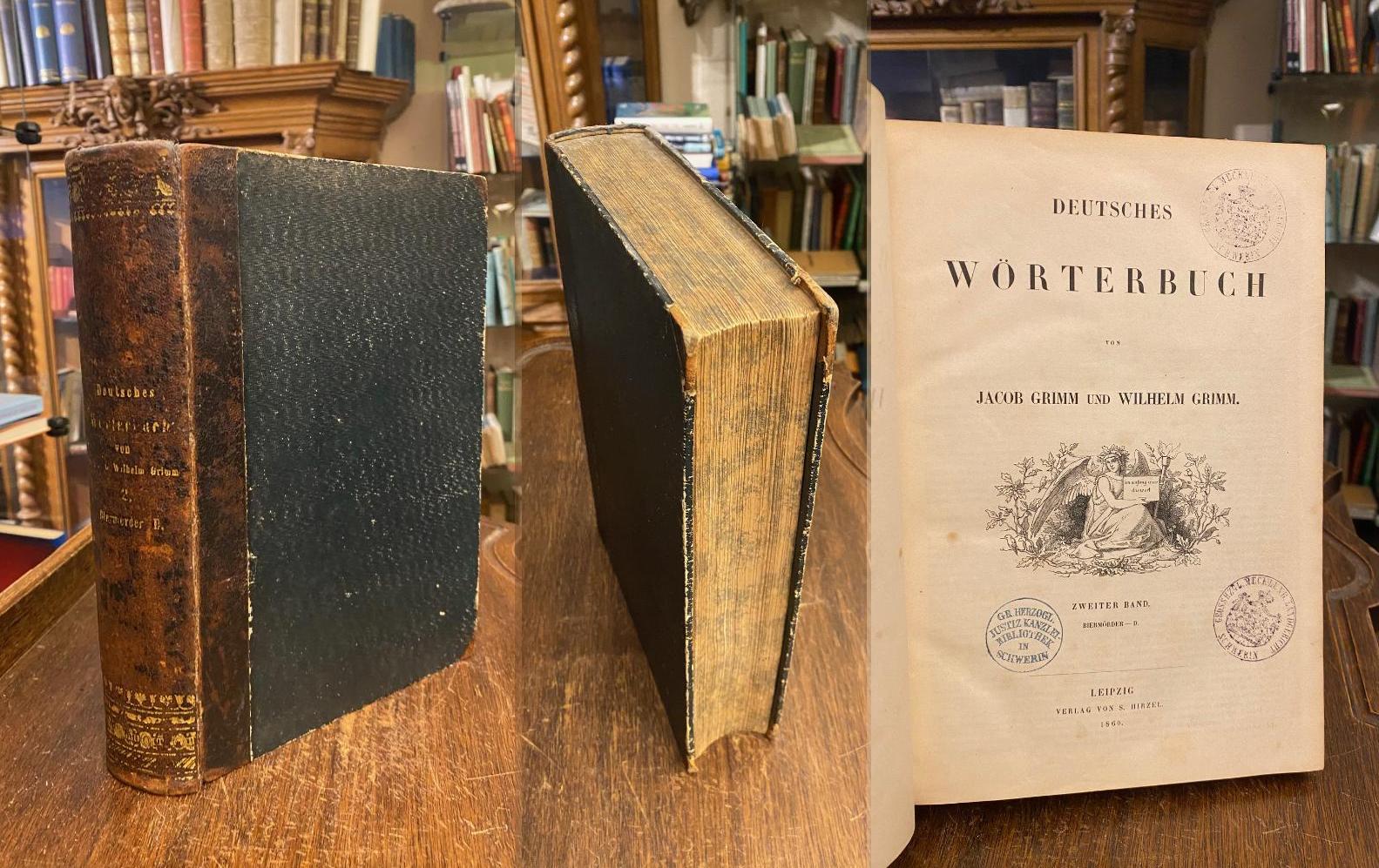 Grimm, Jacob und Wilhelm: Deutsches Wörterbuch : Zweiter Band: Biermörder – D. Leipzig, Verlag von S. Hirzel, 1860. 4° (27x18), XIII S., 1776 Sp., Hldr mit goldRückenPrägung, Rücken berieben, mehrfach gestempelt (Grossherzogl. Justiz-Kanzlei/Landgericht Schwerin), gebräunt, fest und sauber, Hier der 2. Band in der Originalausgabe.–