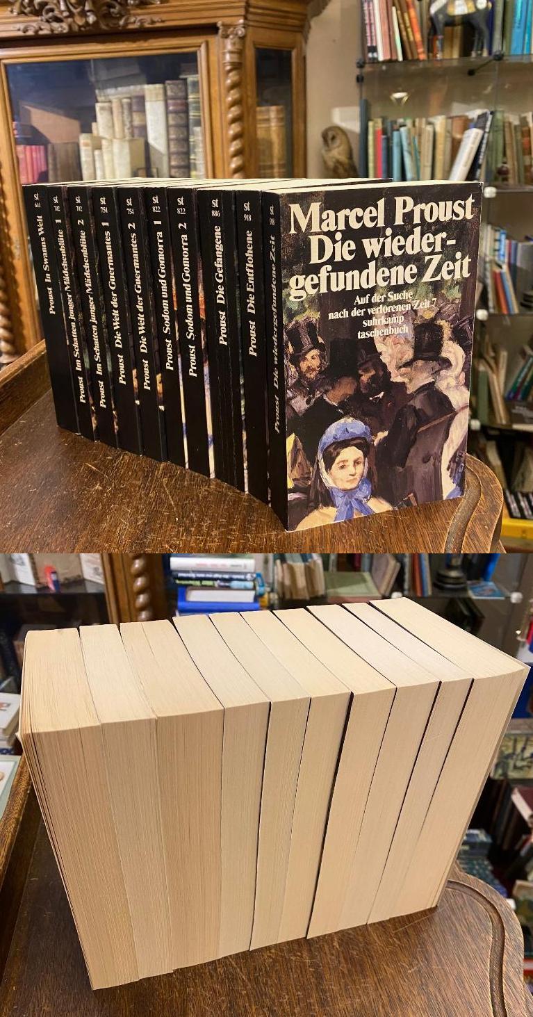 Proust, Marcel: Auf der Suche nach der verlorenen Zeit [vollständige Ausgabe in sieben Bänden]. Aus dem Französischen (A la recherce du temps perdu) von Eva Rechel-Mertens. Mischauflage, 7 Bände in 10 (so komplett), Frankfurt/M, Suhrkamp Verlag, (1981-1984) Folgeauflagen. 8° (17x10), 563; 281; [283]-692; 411; [413]-785; 346; [347]-721; 555; 378; 506 S., ill OKart (Brosch TB), kh sauber und wohlerhalten, [= Suhrkamp Taschenbuch; 644 / 702.1 / 702.2 / 754.1 / 754.2 / 822.1 / 822.2 / 886 / 918 / 988], Bandeinteilung: BAND 1: In Swanns Welt.– BAND 2.1: Im Schatten junger Mädchenblüte I.– BAND 2.2: Im Schatten junger Mädchenblüte II.– BAND 3.1: Die Welt der Guermantes I.– BAND 3.2: Die Welt der Guermantes II.– BAND 4.1: Sodom und Gomorra I.– BAND 4.2: Sodom und Gomorra II.– BAND 5: Die Gefangene.– BAND 6: Die Entflohene.– BANd 7: Die wiedergefundene Zeit.–