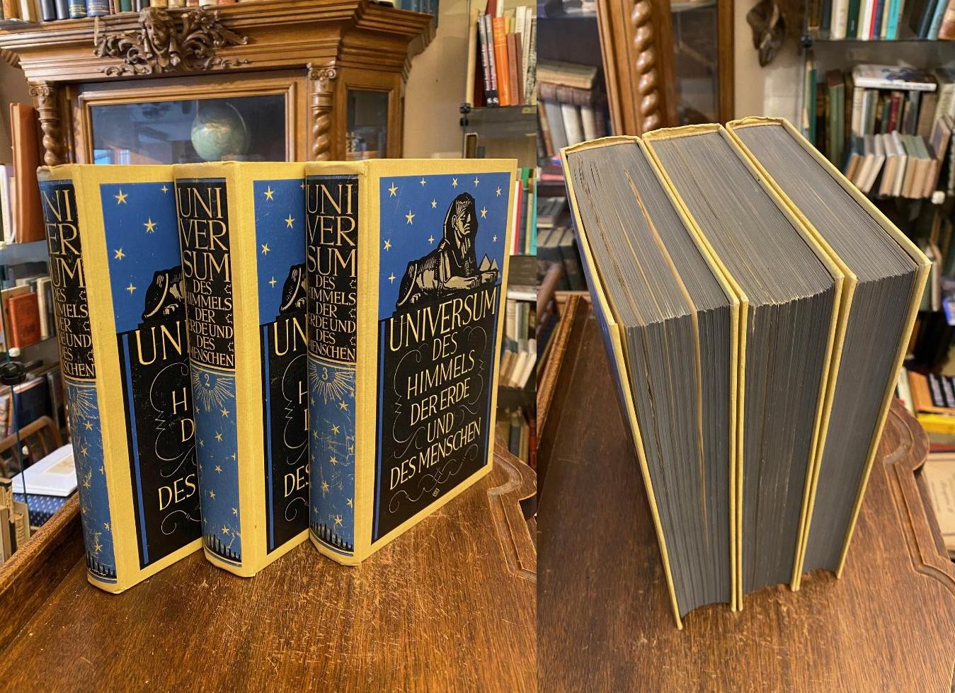 Hoffmann, Oskar (Hrsg): Universum des Himmels, der Erde und des Menschen [in 3 Bänden]. Nach neuesten Quellen bearbeitet von Oskar Hoffmann unter Mitwirkung der hervorragenden Fachgelehrten Klinkerfues, Bilfinger, Aschke, Schaarschmidt, Pannwitz, Schiebold, Schiebold, Bandmann und unter Benutzung von Textunterlagen von Alfred Kirchhoff. 3 Bände in 3 (so komplett), Dresden-Radebeul und Leipzig, Verlag von F. E. Bilz, [1926]. gr8° (24x17), BAND I: XVI, 98, 105, 61, 335; BAND II: 224, 500; BAND III:200, 36, 68, 39, 294, 41, 14 S., mit 1537 Textbildern, 69 farb und schwarzen Tafeln und Karten, 2 vierteilige Modelle, 1 Modelltafel und 1 Leporellotafel, Oln mit Deckel- und RückenPrägung, dreiseitiger Farbschnitt, Eine Modelltafel lose, In Band III 5 Blatt gewellt, sonst nahezu ungelesen, schöne gepflegte Exemplare, Einband nach Entwurf von Georg Belwe an der Staatlichen Akademie für Graphische Künste und Buchgewerbe zu Leipzig.–