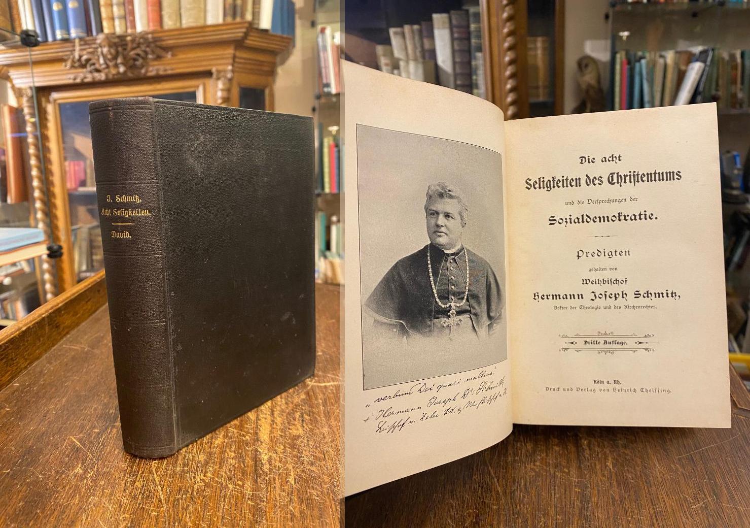 Schmitz, Hermann Josef: Die acht Seligkeiten des Christentums und die Versprechungen der Sozialdemokratie : Predigten gehalten von Weihbischof Hermann Joseph Schmitz, Doktor der Theologie und des Kirchenrechts. : ANGEBUNDEN: ders.: Daviod, der Mann der Hoffnung auf Gott in einem Cyklus von Predigten zur Belebung der christlichen Hoffnung dargestellt von Weihbischof Hermann Joseph Schmitz. 3. Aufl., Köln, Verlag von Heinrich Theissing, (1900). 8° (19x14), VIII, 184; VII, 233 S., jeweils mit Porträtfrontispiz, schwarzer Oln gewachst mit goldRückentitel, kleiner Name auf Vorsatz, sauber und wohlerhalten,
