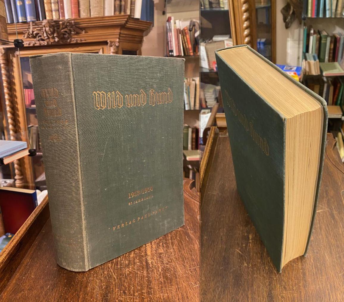 Wild und Hund 1953/1954 – Jahrgang 56 : Heft 1 (April 1953) – Heft 26 (März 1954). Vereinigt mit St. Hubertus – Der Heger – Jagd und Hege. Hamburg und Berlin, Verlag Paul Parey, 1953 – 1954. 4° (29x20), 11 S. (Register), 452 (Innenteil), 600 (Aussenteil), mit 637 Abb., grüner Oln mit goldTitel, fest sauber und gepflegt, kompletter Jahrgang mit 26 Heften mit den farb Umschlägen.– durch Jahresregister erschlossen.– Innenteil und Aussenteil nacheinander fortlaufend gebunden.– ohne die 5 Kunstbeilagen.–