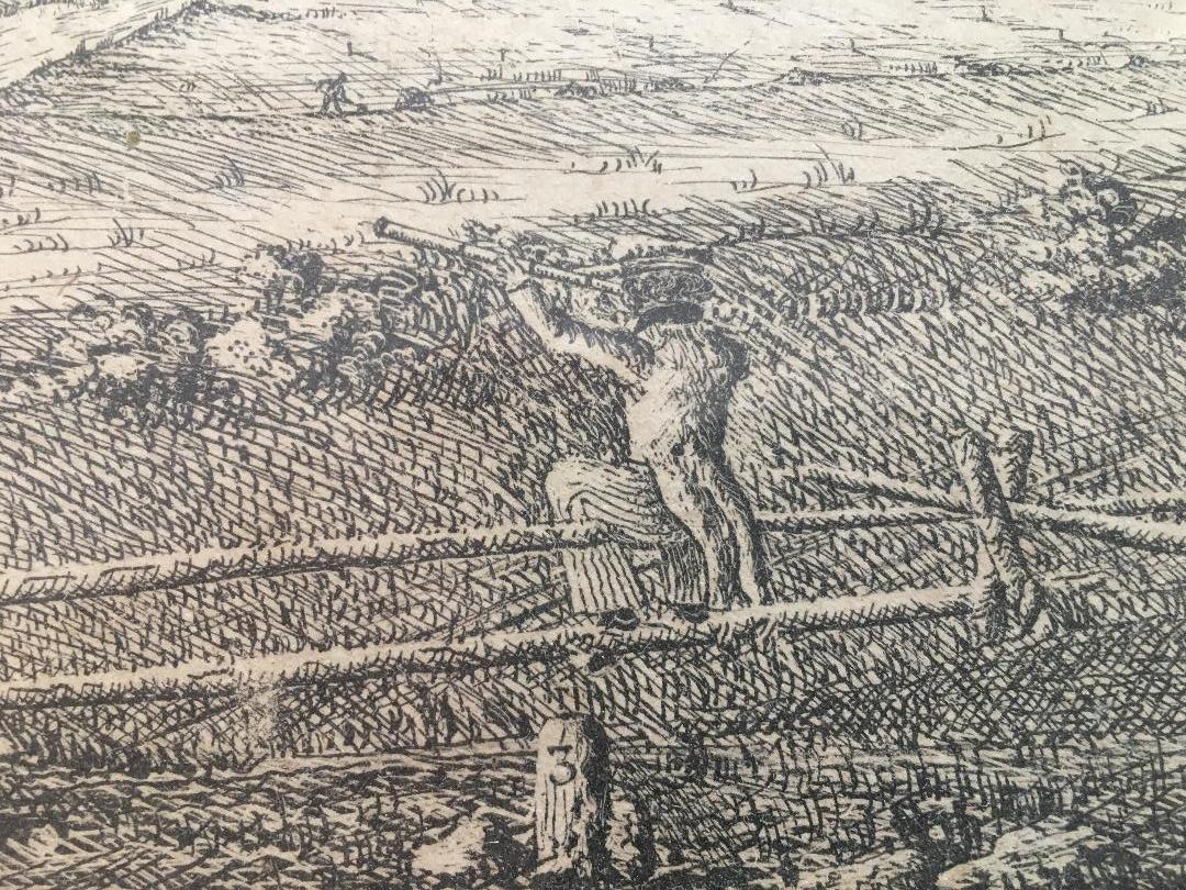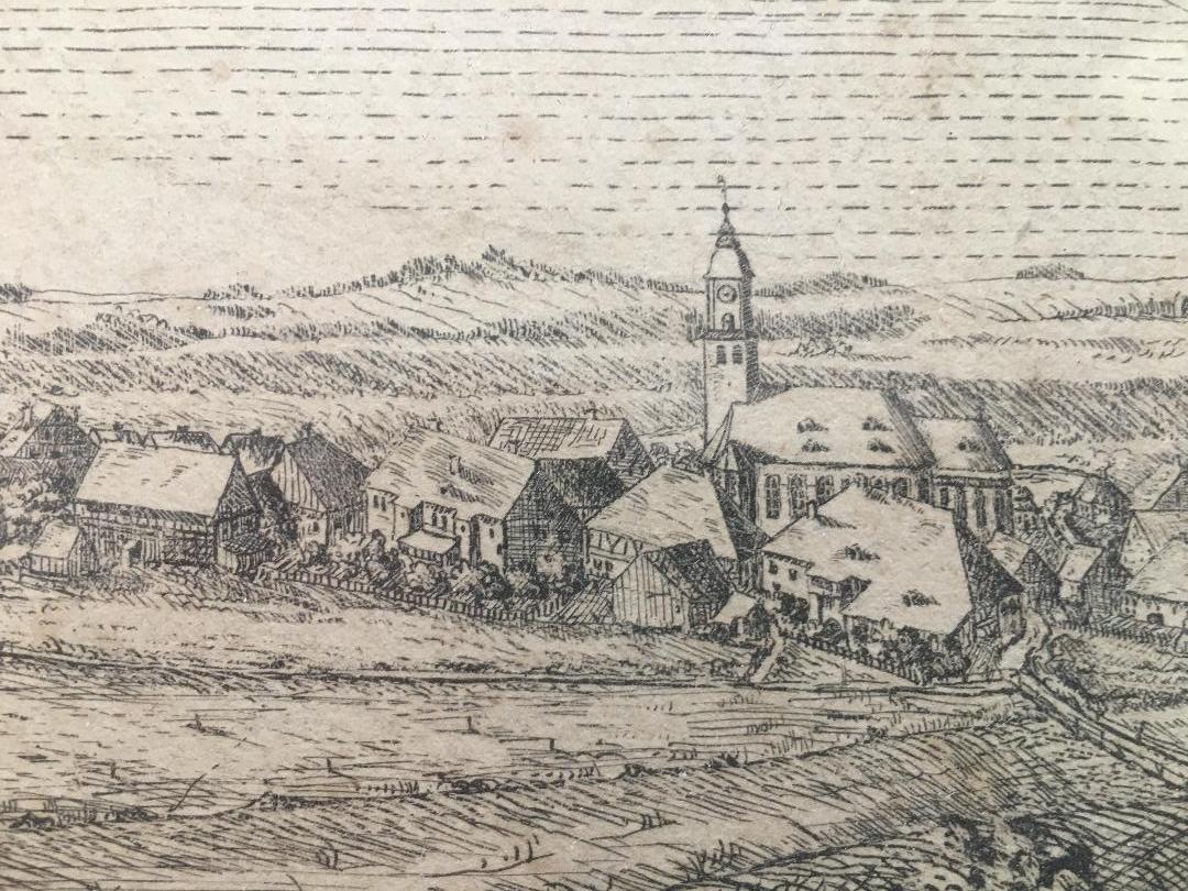 Wurzach, Bad. – Feller, Conrad (1808-1830): ‚Süd östliche Ansicht von Wurzach.‘ aufg. u. auf Stein gez. v. C. Feller. Blick vom Gottesberg über die Ach auf die Stadt, im Vordergrund auf Zaun junger Wanderer mit Fernrohr. Federlithographie, um 1825. Bildformat 20 x 36 cm, unter Passepartout/Glas gerahmt, Papier schwach braunfleckig, gutes Exemplar, [Nicht bei Schefold].— von größter Seltenheit! – Noch ganz im Stil einer lithographischen Inkunabel.– Conrad Feller (14.7.1808 Wurzach – 12.10.1830 Heilbronn) entstammt der noch wenig erforschten Wurzacher Goldarbeiterfamilie Feller. Er war offensichtlich auch Goldarbeiter, vermutlich bei seinem Halbbruder Peter Paul. Daneben betätigte er sich als Lithograph.– Er starb nur 22jährig.– in einer Notiz zu seinem Tod im Verkündbuch Bd. III von 1830 des Pfarramt St. Verena Bad Wurzach wird er als Goldarbeiter und ‚Graveur‘ bezeichnet. — „Eine lithographierte und signierte Stadtansicht Wurzachs von seiner Hand befindet sich in Privatbesitz“ (Otto Frisch/Werner Schmidt in Weltkunst 11/2001; 1737 Anm. 20).–