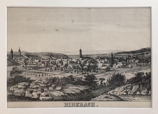 Biberach. – ‚Biberach‘ : Gesamtansicht : im Vordergrund Steingeschröff. Lithographie nach Emminger, [um 1840]. Bildformat 14.5 x22.5 cm, [Scheffold, Württemberg; 565],