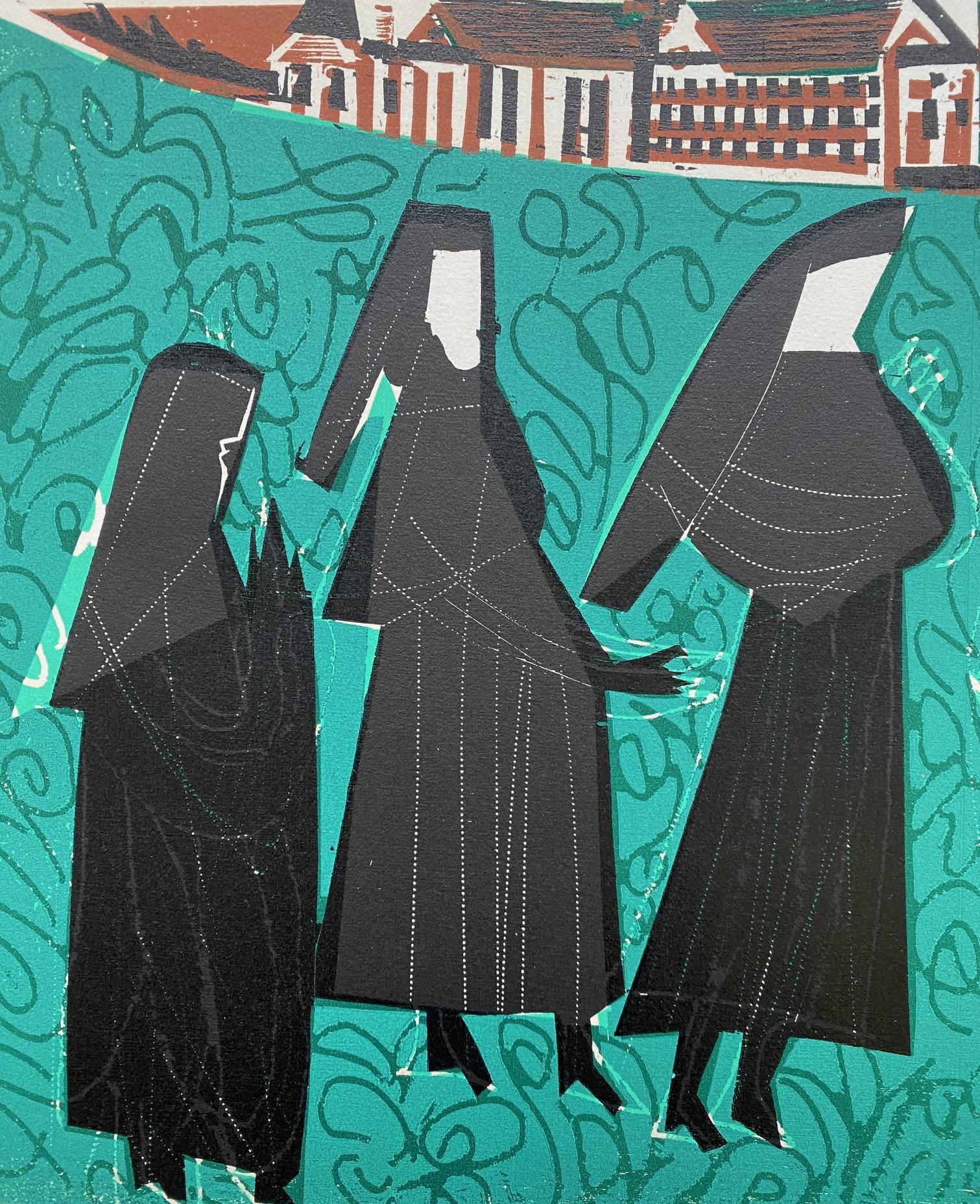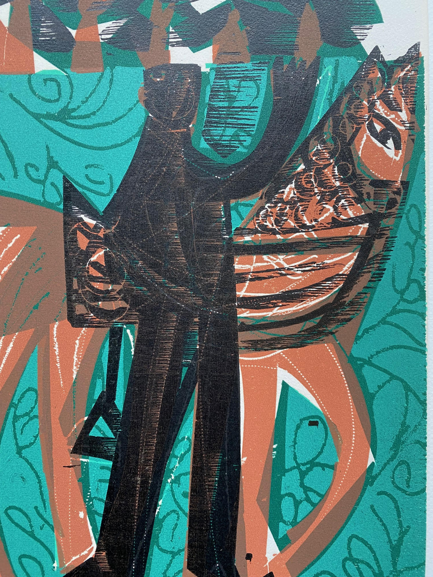 Grieshaber, HAP (1909 Rot a.d. Rot – 1981 Eningen unter Achalm). – ‚Abschied‘ : Holzschnitt bis zum Blattrand in dunkelgrün, hellgrün, ocker, schwarz : aus der Mappe Osterritt : Köln, Werkstätten Galerie Der Spiegel (Druck). 1964. Bildformat 32 x 54 cm, säurefrei auf Trägerkarton montiert, frei in Passepartout wohnertig gerahmt 50 x 70 cm, geglättete Mittelfalte, * Fürst 64/74
