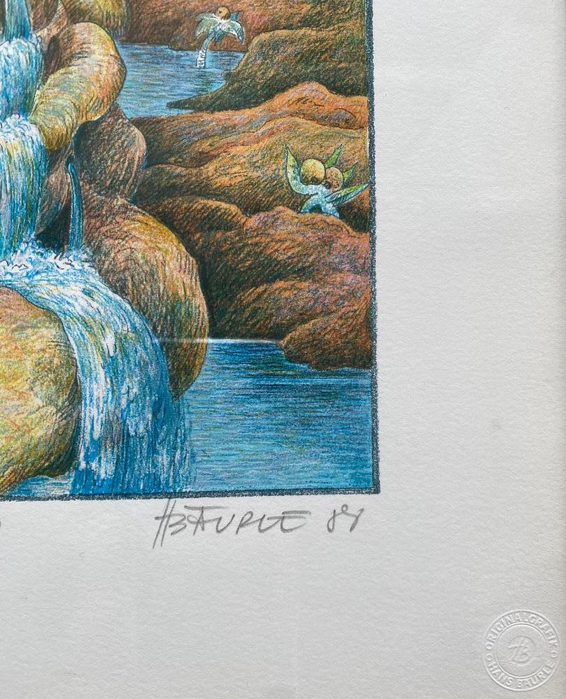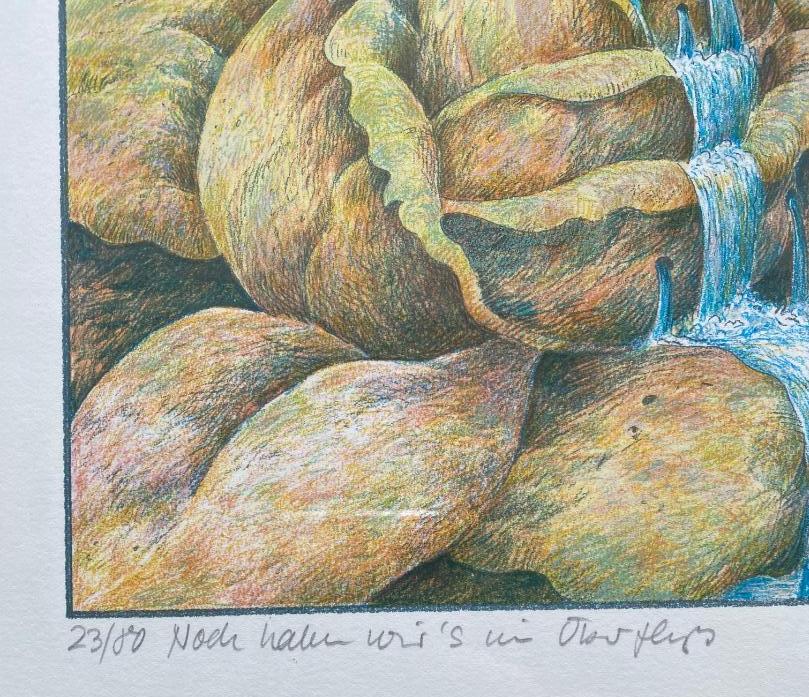 Bäurle, Hans (1931 – 2024). – ’Noch haben wir’s im Überfluß’ : Serigrafie in 15 auf Rives Bütten : Papier mit Blindstempel, mit Bleistift numeriert 23/80, bezeichnet, handsigniert und datiert ’88 : 1988. Bildformat 30 x 22 cm, im Original Alu-Rahmwen 42 x 33 cm wohnfertig gerahmt, * Strüber Werkverzeichnis, 1260