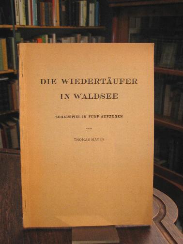 Mayer, Thomas: Die Wiedertäufer in Waldsee. Schauspiel in fünf Aufzügen. Waldsee, Heimatverein Waldsee / Druck, Viktor Liebel, [1948]. 8° 47 S., OKart (Brosch), gebräunt, sauber, ‚Die Wiedertäufer‘ wurde aufgeführt am 4.Juli 1948 von der Laienspielgruppe Waldsee unter der Regie von Victor Dräger (Intendant der Schwäbischen Volksbühne Tuttlingen).– Ort der Handlung Waldsee, 1530.— beiliegend: kurzes Festprogramm zur 650-Jahrfeier der Stadt Waldsee 4.-11.Juli 1948.–