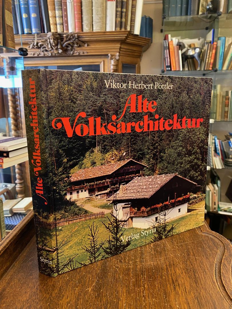 Pöttler, Viktor Herbert: Alte Volksarchitektur. Graz; Wien; Köln, Verlag Styria, (1975). 4°quer (27x28), 143 S., mit zahlr. TextAbb. sowie 56 teils farb fotograf Aufnahmen auf Tafeln, foto ill OPbd, 1 Farbmarkierung, sonst nahezu ungelesen, schönes gepflegtes Exemplar, Vorliegendes Werk stellt die österreichischen und süddeutschen Hauslandschaften in Wort und Bild vor. Die geschichtliche Entwicklung kommt ebenso zur Geltung wie der europäische Zusammenhang. Der Autor, Schöpfer des Österreichischen Freilichtmuseums, zeigt an Hand zahlreicher Konstruktionszeichnungen und Fotos den Weg auf, der von den ersten Bemühungen des Steinzeitmenschen, sich ein Dach über dem Kopf zu schaffen, bis zur Entfaltung der verschiedenen Bauernhaustypen führt. Als Praktiker der Hauskunde berichtet er über Baustoff und Konstruktion, über Wand und Dach, über die verschiedenen Techniken des Holzbaues und stellt den Lesern auch die vielfältigen Bemühungen um die Bewahrung der alten Volksarchitektur vor.