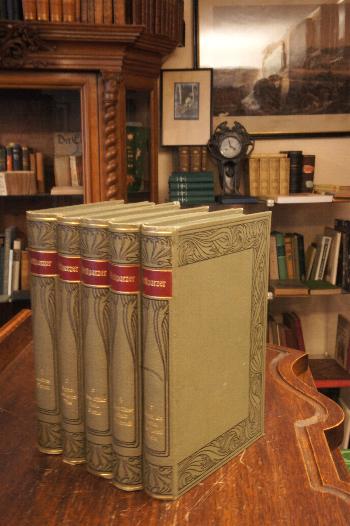 Hebbel, Friedrich (1813-1863). – Zeiss, Karl (Hrsg): Hebbels Werke [in vier Bänden]. Kritisch durchgesehene und erläuterte Ausgabe. 4 Bände in 4 (so komplett), Leipzig; Wien, Bibliographisches Institut, (1899). 8° (19x12), 93,399; 404; 378; 404 S., mit PorträtFrontispiz, 1 HandschriftFaksimile, einheitlich grüne Olnbde mit Jugendstil-Schmuckrahmen, rot geprägt RSchild, dreiseitiger GrünSchnitt, florale SchmuckVorsätze, nahezu ungelesen, fest sauber und gepflegt, [= Meyers Klassiker-Ausgaben : herausgegeben von Ernst Elster], [Sarkowski BI 22,20].— Bandeinteilung: Band 1: Gedichte.– Epigramme und Verwandtes.– Mutter und Kind.– Erzählungen und Novellen (Schnock.– Der Rubin.– Der Schneidermeister Nepomuk Schlägel auf der Freudenjagd.– Pauls merkwürdigste Nacht.– Herr Haidvogel und seine Familie).– Band 2: Dramen (Judith.– Maria Magdalene.– Michel Angelo.– Agnes Bernauer.– Gyges und sein Ring).– Band 3: Nibelungen.– Ästhetisches (Mein Wort über das Drama.– Über den Stil des Dramas.– Wie verhalten sich im Dichter Kraft und Erkenntnis zueinander?.– Das Komma im Frack.– Das deutsche Theater).– Band 4: Genoveva.– Herodes und Mariamne.– Meine Kindheit.–