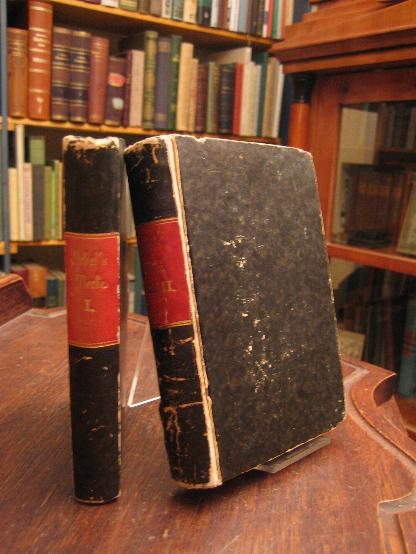 Hebel, Johann Peter (1760-1820). – J. P. Hebel’s Werke : Ausgabe in drei Bänden. Mit Hebels Bildnis, einem Facsimile seiner Handschrift und vier Musikbeilagen. 3 Bände in 2 (komplett), Karlsruhe, Verlag der Chr.Fr.Müller’schen Hofbuchhandlung, 1847. 8° (16x11), CXX,272; 317,266 S.,jeweils gestochenes Frontispiz, 2 Bl.gefaltetes Brieffaksimile, 4 gefalteten Notentafeln, einheitl Pbde d.Zt. mit goldgepräg roten RSchild, Kanten/Ecken etwas bestossen, Name auf Vorsatz, wenige Seiten schwach fingerfleckig, sonst fest und sauber, Bandeinteilung: Band I: Vorwort zur Ausgabe von 1843.– Vorwort zur Ausgabe in drei Bänden.– Biographisches Einleitung.– Zu Hebels Ehrengedächtnis. Vom Adjunkten des rheinländischen Hausfreundes.– Allemannische Gedichte.– Gedichte in hochdeutscher Sprache.– Lateinische Übertragung von Kirchenliedern.– Rätsel, Charaden und Logogriphen (mit Auflösung).– Worterklärungen.— Band II: Erzählungen des rheinländischen Hausfreundes, Erste Abteilung.— Band III: Erzählungen des rheinländischen Hausfreundes, Zweite Abteilung.– Vermischte Aufsätze.– Beiträge zur Religionsphilosophie.
