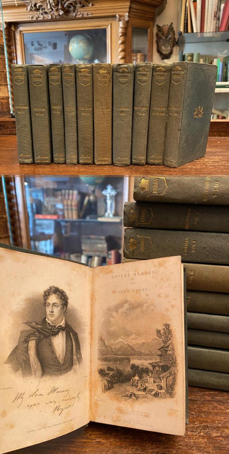 Byron, George Gordon Lord (1788-1924). – Byron, Lord: Byron, Lord: [Works 10 volumes]: Child Harold.– Don Juan in 2 Vol.– Dramas in 2 Vol.– Tales in 2 Vol.– Miscellanies in 3 Vol.– With Engravings by E.Finden. With notes, comentaries, appendixes. 10 vol in 10. London, John Murray, 1837. 12° (14x8), 336; 376; 395; 403; 391 263; 260; 316; 305; 288 p., with 11 engravings by E.Finden, publisher’s hardbound bluegreen cloth with ornamentic and gilt (‚Crede Byron‘ – the Byron family coat-of-arms) on front and gilt titled on spine with a crown on top, full gilt edges, sl aged, all volumes are tight and clean in general, sl foxing to the engravings and few pages, nice pocket-edition from Byron’s publisher Murray, Albemarle St.– Ten not numbered volumes: Child Harold’s Pilgrimage.— Don Juan I+II.— Dramas I (Manfred.– Marino Faliero.– Heaven and Earth).— Dramas II (The Two Foscari.– Cain.– The Deformed Transformed.– Werner).— Tales I (The Giaour.– The Bride or Abydos.– The Corsair.– Lara).— Tales II (Siege of Corinth.– Parisina.– Prisoner of Chillon.– Beppo.– Mazeppa.– The Island).— Miscellanies I (Hours of Idleness.– English Bards and Scothch Reviewers.– Hints from Horace).— Miscellanies II (The Curse of Minerva.– The Waltz.– Ode to Napoleon Buonaparte.– Hebrew Melodies.– The Morgante Maggiore of Pulci.– The Prophecy of Dante.– The Blus.– The Vision of Judgement.– The Age of Bronze.— Miscellanies III (Occasional Pieces 1807-1824).– the engravings show the portrait of Byron after G.Sanders with note facsimile to Murray and stations of the life of Byron: from Newsteadt Abbey, the Exile Lake Geneva, to some scenes in Greece for example the Acrocorinthus and Mount Parnassus.—
