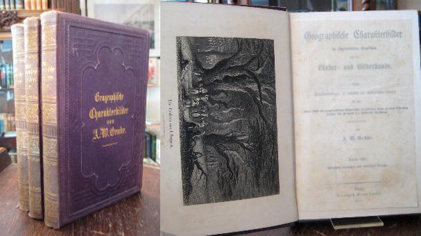 Grube, August W.: Geographische Charakterbilder [in drei Bänden] : in abgerundeten Gemälden aus der Länder- und Völkerkunde. Nach Musterdarstellungen der deutschen und ausländischen Liteatur für die obere Stufe des geographischen Unterrichts in Schulen, sowie zu einer bildenden Lectüre für Freunde der Erdkunde überhaupt. BAND 3 unter dem Titel: Charakterbilder deutschen Landes und Lebens für Schule und Haus. 14./14./10, vermehrte und verbesserte Aufl., 3 Bände in 3, Leipzig, Friedrich Brandstetter, 1875. 8° (22x14), XVI,725; VI, 484 XIV,490 S., jeweils mit gestochenem Frontispiz, einheitl Olnbde mit blindPräg und goldTitel, Rücken minimal aufgehellt, Name auf Vorsatz, gepflegte Exemplare, fest und sauber,