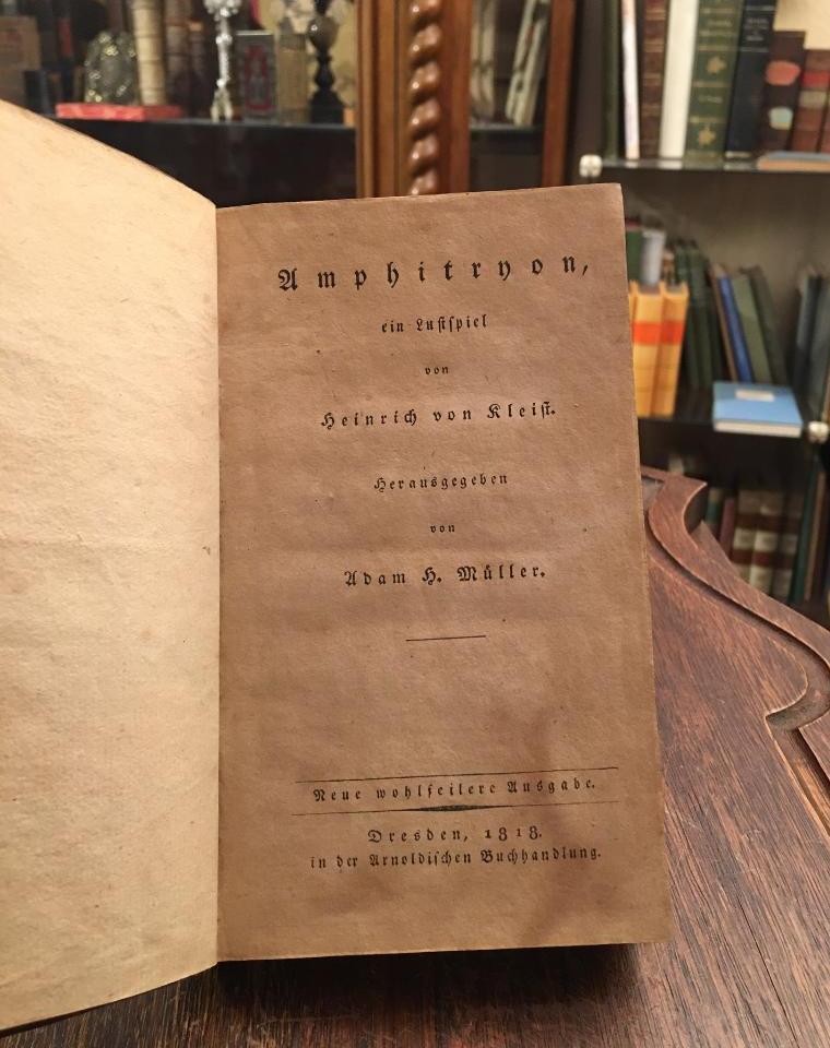 Kleist, Heinrich von: Amphitryon : ein Lustspiel. Herausgegeben von Adam H. Müller. Neue wohlfeilere Ausgabe. [2. Aufl.], Dresden, in der Arnold’ischen Buchhandlung, 1818. kl8° (16.5x10.5), 1 Bl., VII, 184 S., braunmarmor Pbd d.Zt. mit gepräg RSchild, Ecken/Kapitale etwas bestossen, oberes Kapital etwas stärker, Name auf Vorsatz, Papier etwas gebräunt, Titel etwas stärker, sonst fest sauber und gepflegt, Erstausgabe [WG² 10.– Sembdner, 29.– Goedeke VI, 10, 2.– Schmidt IV, 315].– Druckvermerk am Schluß ‚Gedruckt bei Carl Gottlob Gärtner‘ Titelauflage der Erstausgabe von 1807.–