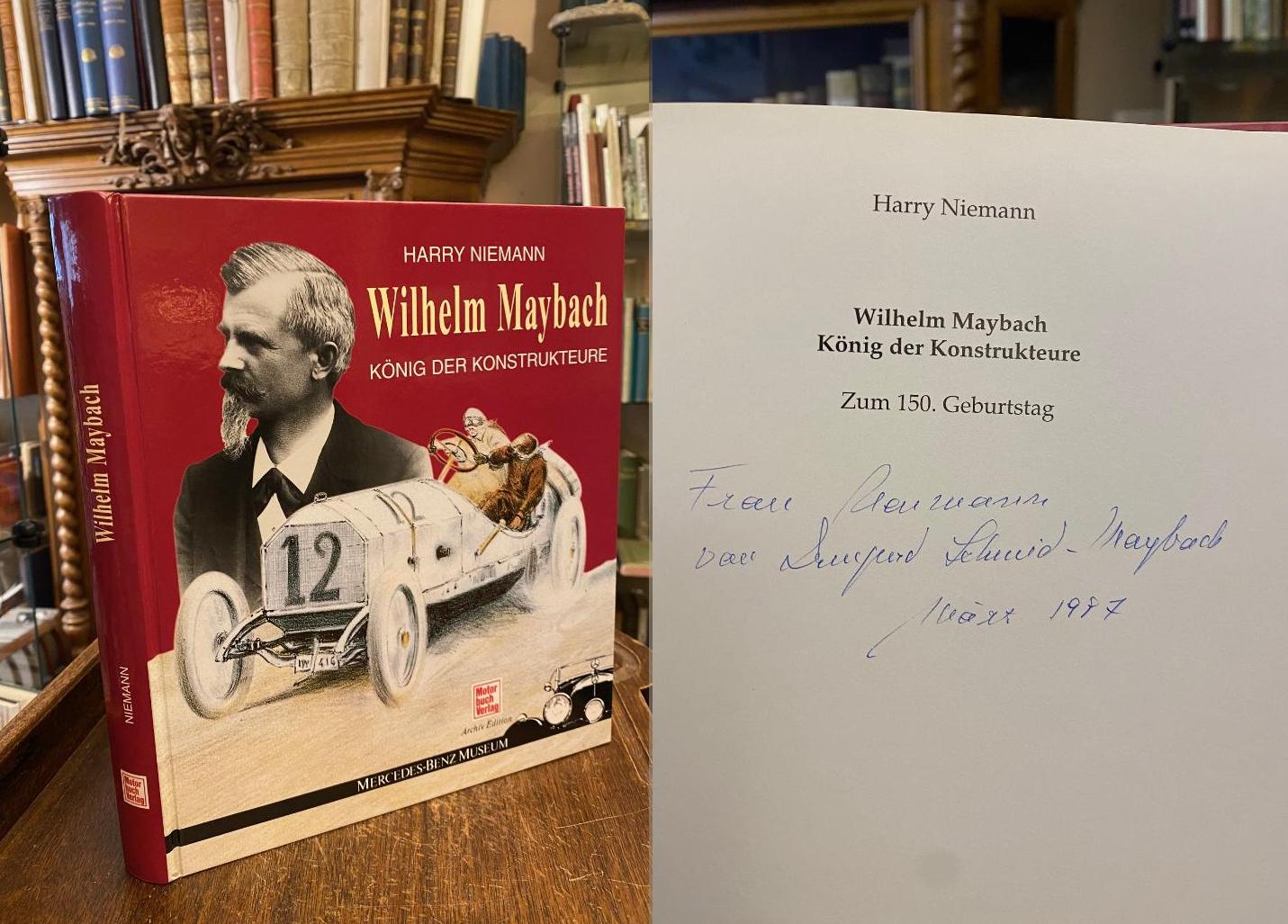 Maybach. – Niemann, Harry: Wilhelm Maybach – König der Konstrukteure : Zum 150. Geburtstag. Herausgegeben von der Mercedes-Benz AG Stuttgart-Untertürkheim, für den Herausgeber Max-Gerrit von Pein und im Auftrag der Stadt Heilbronn herausgegeben vom Christhard Schrenk. 1. Aufl., Stuttgart, Motorbuch Verlag, 1995. 4° (27x23), 285 S., reich illustriert mit historischen und dokumentarischen Abb., ill OPbd, nahezu ungelesen, schönes gepflegtes Exemplar, [= Historisches Archiv der Mercedes-Benz AG : Stadtarchiv Heilbronn / Mercedes-Benz Classic – Archiv-Edition / Kleine Schriftenreihe des Archivs der Stadt Heilbronn; 39], Auf Vortitelblatt handschriftliche Widmung der Tocher von Karl Maybach ‚[Name] / von Irmgard Schmid-Maybach / März 1987‘