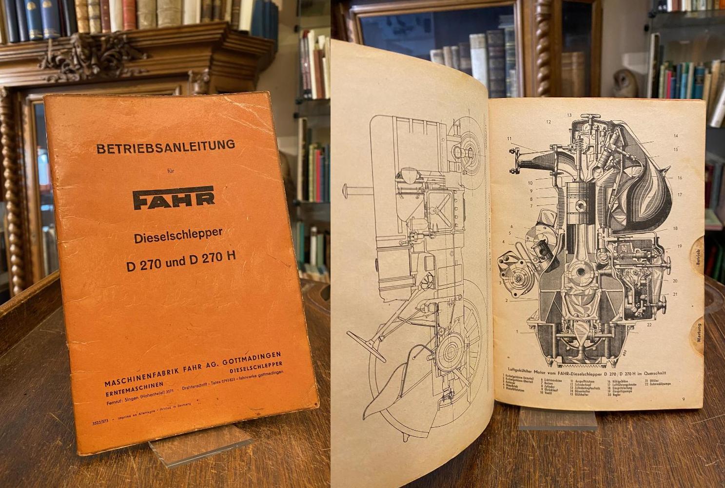 Fahr, Marschinenfabrik : Gottmadingen (Hrsg): Betriebsanleitung für Fahr Dieselschlepper D 270 und D 270 H. Gottmadingen, Maschinenfabrik Fahr AG, [1957]. 8° (21x15), 48 S., mit zahlr. Abb., OKart (Brosch), etwas angeschmutzt, teils etwas fingerfleckig, gutes Exemplar, [= Verlags-Nr. 3523/573], Der Schlepper D 270 H hatte einen luftgekühlten 24 kW (32 PS)-Dieselmotor und war mit Dreipunkt-Gerätekupplung, hydraulischem Kraftheber und Fünfgangtriebwerk mit Kriechgang ausgestattet. Von 1954 bis 1958 wurden insgesamt 1703 Schlepper dieses Typs hergestellt.–