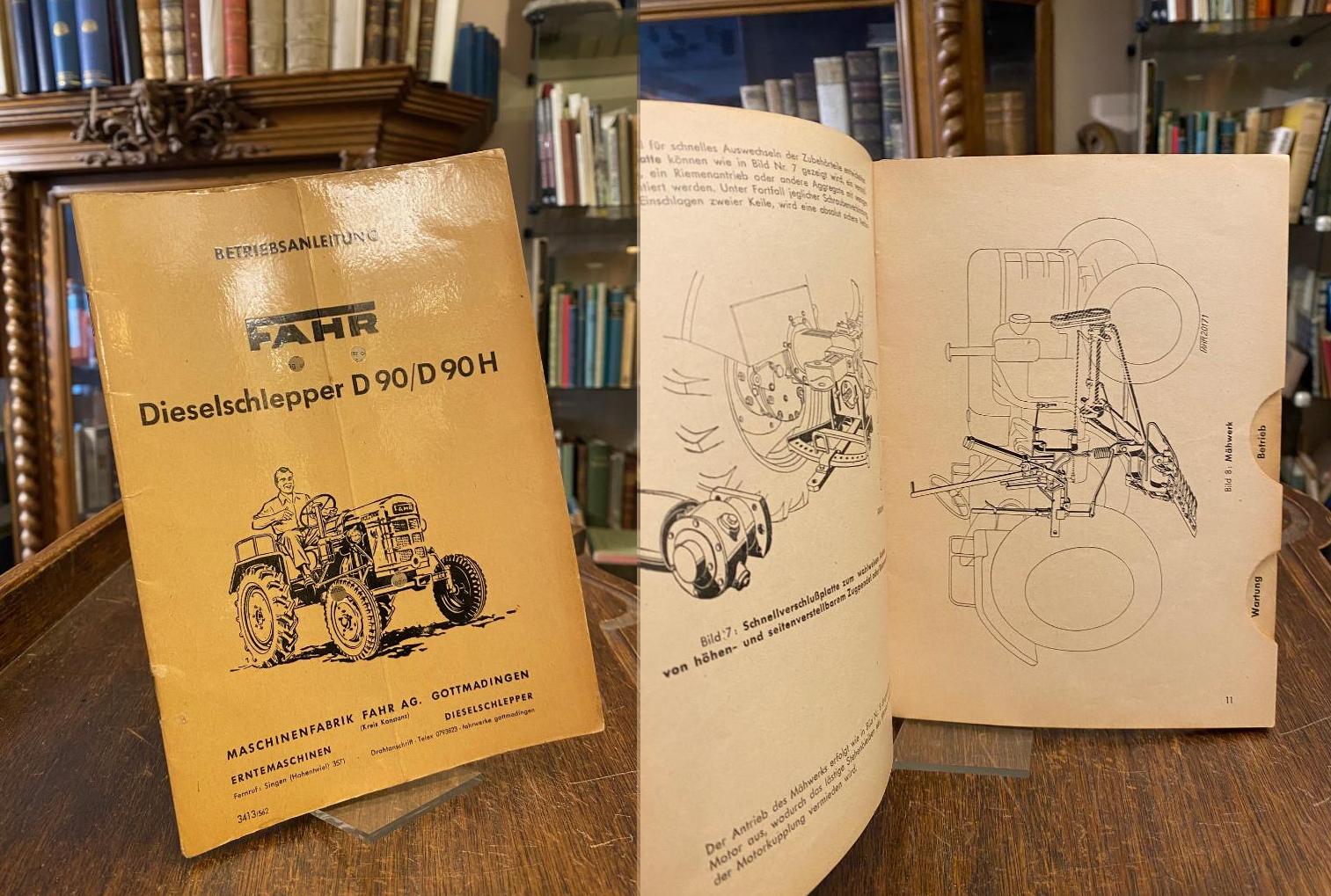 Fahr, Marschinenfabrik : Gottmadingen (Hrsg): Betriebsanleitung Fahr Dieselschlepper D 90 / D 90 H. Gottmadingen, Maschinenfabrik Fahr AG, [1956]. 8° (21x15), 32 S., mit zahlr. Abb., OKart (Brosch), vorderdeckel mit Mittelfalte gelocht, vereinzelt gering fingerfleckig, gutes Exemplar, [= Verlags-Nr. 3413/562], Um dem Trend der Kundschaft zu luftgekühlten Motoren entgegen zu kommen, brachte Fahr Anfang 1954 den D 90 auf den Markt, nur wenige Monate später folgte die Hochradversion D 90 H. Die Modelle basierten auf dem wassergekühlten D 12, der noch einige Zeit parallel weiter produziert wurde, dann aber aus dem Lieferprogramm verschwand. Der Motor wurde bei MWM zugekauft, anfangs der AKD12E, später der in Details verbesserte Nachfolger AKD112E, der aber die gleichen Daten aufweist. Die Motoren haben 0,9 Liter Hubraum und eine Leistung von 12 PS bei 2000 U/min. Gebaut wurden zwischen 1954 und 1956 4260 bzw 1237 Einheiten.–