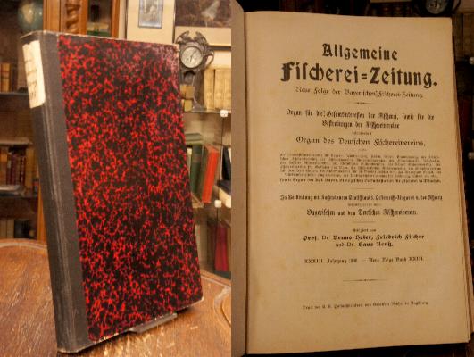 Hofer, Bruno / Fischer, Friedrich / Reuß, Hans [Red]: Allgemeine Fischerei-Zeitung XXXIII. Jahrgang 1908, Neue Folge Band XXIII. Neue Folge der Bayerischen Fischerei-Zeitung. Herausgegeben vom Bayerischen und dem Deutschen Fischereiverein. Organ für die Gesammt-Interessen der Fischerei, sowie für die Bestrebungen der Fischereivereine, insonderheit Organ des Deutschen Fischereivereins, der Landesfischereivereine für Bayern, Sachsen, Württemberg, Baden, des Westdeutschen Fischereiverbandes etc. Augsburg, Gebrüder Reichel, 1908. 4° (26x17), X , 554 S., marmor Hln d.Zt. mit handschriftl RSchild, obEinbandEcke mit kleiner oberflächlicher FeuchtigkeitsSpur, sonst fest sauber und gepflegt, [ = Allgemeine Fischerei-Zeitung Jg 33 / NF 23 (1908)], (Fischereizeitung) kompletter Jahrgang 1908 mit 24 Heften, durch Register erschlossen.–