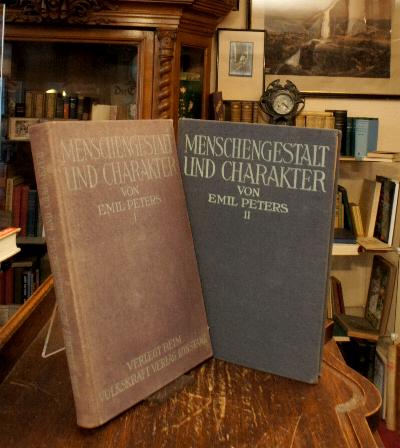 Peters, Emil: Menschengestalt und Charakter : Lehrbuch der praktischen Menschenkenntnis [in zwei Bänden] : I.Kopf und Gesicht.– II.Körperformen, Gliedmaßen und Formtypen. 1. Aufl., Konstanz (Baden) bzw Emmishofen (Schweiz), Volkskraft-Verlag, 1922-1923. gr8° (24x16), VII,366; 349 S., mit 385 + 197 Abb., Olnbde, lichtverfärbt und etwas angestaubt, Vorsatz von Band 2 leicht geöffnet, gute Exemplare,