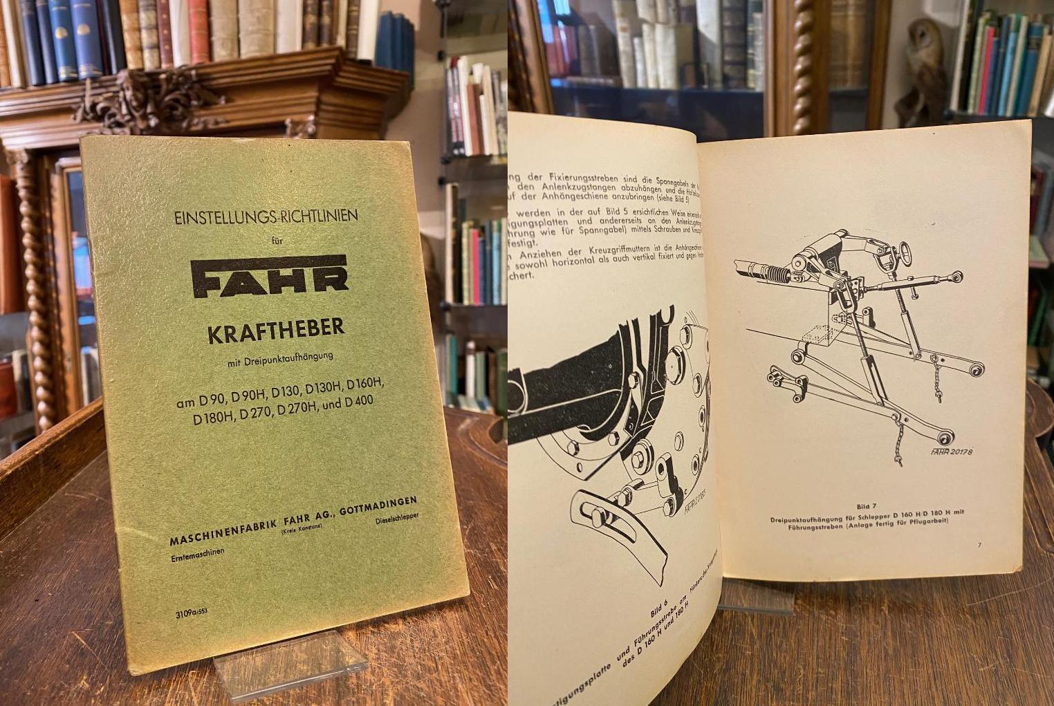 Fahr, Marschinenfabrik : Gottmadingen (Hrsg): Einstellungs-Richtlinien für Fahr Kraftheber mit Dreipunktaufhängung am D 90, D 90 H, D130, D 130 H, D 160 H, D 180 H, D 270 und D 270 H und D 400. Gottmadingen, Maschinenfabrik Fahr AG, [1955]. 8° (21x15), 16 S., mit zahlr. Abb., OKart (Brosch), etwas lichtverfärbt und gebräunt, gutes Exemplar, [= Verlags-Nr. 3109a/553],