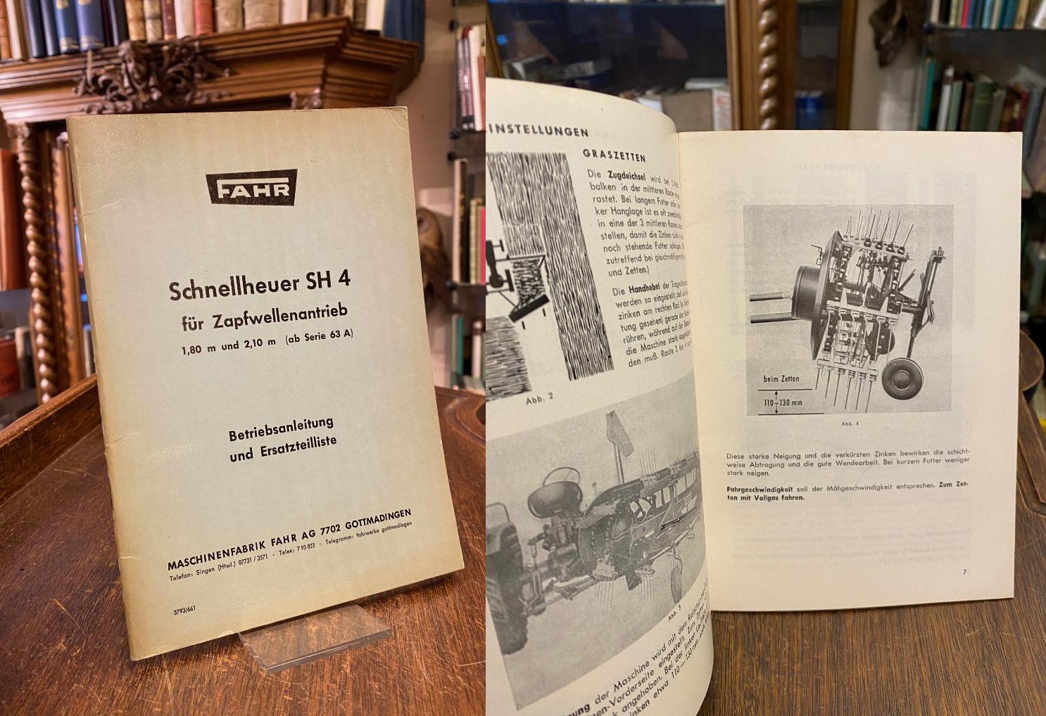 Fahr, Marschinenfabrik : Gottmadingen (Hrsg): Fahr Schnellheuer SH 4 für Zapfwellenantrieb 1,80 m und 2,10 m ((ab Serie 63 A) : Betriebsanleitung und Ersatzteilliste. Gottmadingen, Maschinenfabrik Fahr AG, [1966]. 8° (21x15), 43 S., mit zahlr. Abb., OKart (Brosch), etwas lichtverfärbt, gutes Exemplar, [= Verlags-Nr. 3793/661],