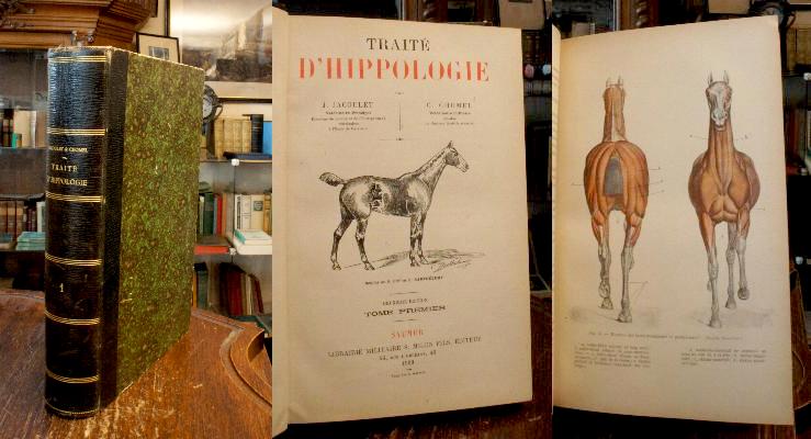 Jacoulet, [Jules] / Chomel, [Claude]: Traite d’Hippologie : tome premier. 2. ed., seulement vol 1 (de 2). Saumur, Librairie Militaire S. Milon Fils Editeur, 1900. 4° (25x16), x, 643 p., avec 301 figures, reliure en demi cuir, tres bon etat,