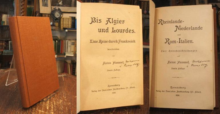 Hummel, Anton: Bis Algier und Lourdes : Eine Reise durch Frankreich, beschrieben von Anton Hummel. [ANGEBUNDEN]: Rheinlande-Niederlande und Rom Italien : Zwei Reisebeschreibungen von Anton Hummel [jeweils handschriftlich hinzugefügt], Stadtpfarrer in Ravensburg.– 2. Aufl., Ravensburg, Verlag der Dorn’schen Buchhandlung (Fr. Alber), 1899 / 1898. 8° (20x13), 242; 216 S., neuer brauner Leineneinband ohne TitelPrägung, schönes gepflegtes Exemplar,