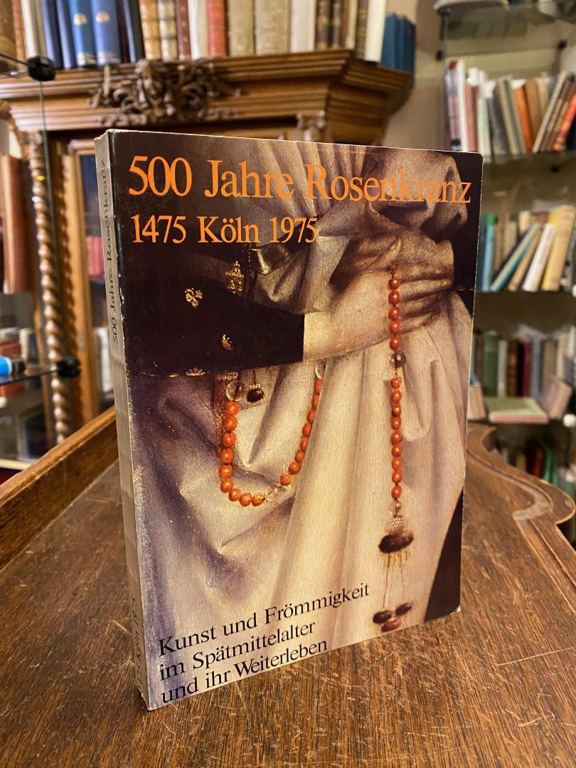 500 [fünfhundert] Jahre Rosenkranz 1475 Köln 1975. (Publikation zur Ausstellung ‚Kunst und Frömmigkeit im Spätmittelalter und ihr Weiterleben‘, Erzbischöfliches Diözesan-Museum Köln, 25. Oktober 1975 bis 15. Januar 1976). Köln, J.B. Bachem (Druck), (1975). 8° (20x14), 208 S., mit 12 ganzseitigen TextAbb., 7 (davon 6 farb Tafeln) + 70 S. Tafelteil mit 70 ganzseitigen Abb., ill OKart (Brosch), Papier leicht gebräunt, schönes gepflegtes Exemplar, enthält folgende Aufsätze: Ferdinand Seibt: Frömmigkeit im ausgehenden Mittelalter.– Karl Joseph Klinkhammer: Die Entstehung des Rosenkranzes und seine ursprüngliche Geistigkeit.– Gislind Ritz: Der Rosenkranz.– Aegisius Gelenius: Die Begründung der Kölner Rosenkranzbruderschaft.– Hatto Küffner: Zur Kölner Rosenkranzbruderschaft.– Die 50 Rosenkranzgeheimnisse des Kölner Dominikanerpriors Jakobus Sprenger von 1475.– Walter Schulten: Das Rosenkranzgebet.— Katalog (A) Auf Rosenkranzbildern häufiger dargestellte Heilige (B) Die den Materialien zugeschriebenen Wirkungen.– Anhänger an Rosenkränzen.– Zeittafel zur Geschichte des Rosenkranzes.– Literaturverzeichnis.–