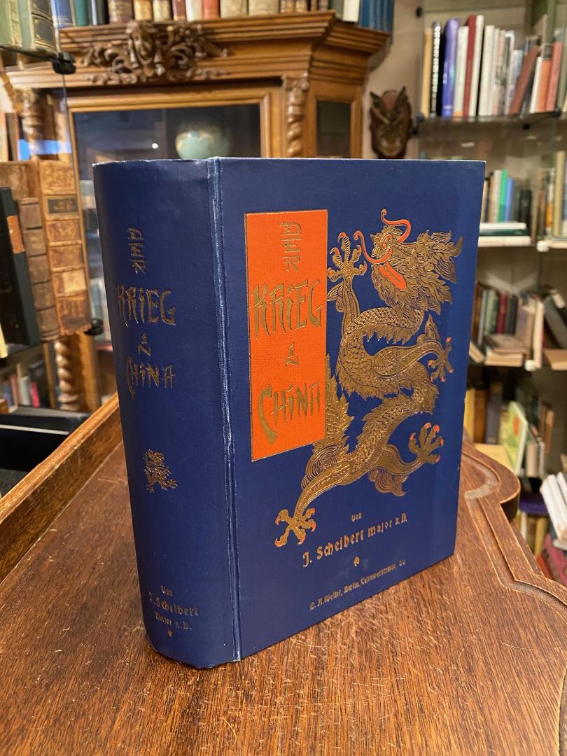 Scheibert, [Justus]: Der Krieg in China 1900-1901 nebst einer Beschreibung der Sitten, Gebräuche und Geschichte des Landes. 2 Bände in 1 Buch, Berlin, Verlag von A. Schröder, 1901-1902. gr8° (23x15), VI,384; VII,400 S., mit jeweils doppelseitigem Frontispiz, weiteren 14 farb/getönten Tafeln, unzähligen TextAbb., sowie 1 mehrfach gefaltete Karte der Ostsprovinzen, blauer Oln gewachst mit goldDrachenPräg, goldTitel, SchmuckVorsätze, Vorsätze etwas geöffnet (stabil), Papier gering gebräunt, kaum gelesen, gutes gepflegtes Exemplar, aus der Bibliothek Schloss Altshausen mit Papiersiegel-Exlibris von Robert Herzog von Württemberg